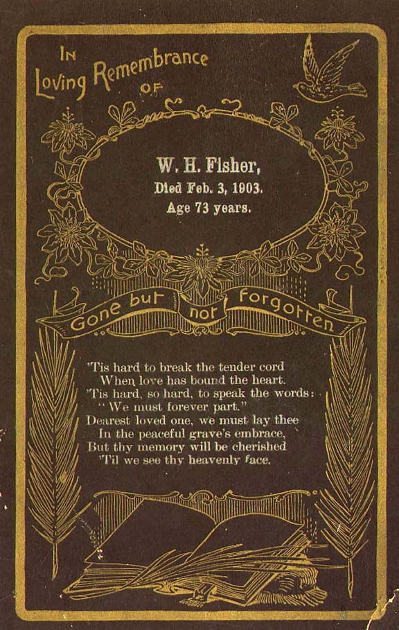 Mrs. Nancy Rachel Fisher, 1908 Funeral Notice, wife of Wm. P. Fisher; Eld. Carey E. Morgan; Pall-Bearers: Wm. Wornall, Jas. L. Dodge, G.K. Redmon, Sam Harding, Frank Skillman & T.J. Redmon.