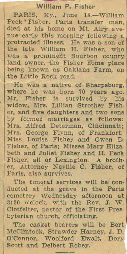 William Peck Fisher dies, son of Wm. H. Fisher; wife: Mrs. Lillian Strother Fisher; children: Mrs. Alfred Determan, Mrs. George Flynn, Miss Louise Fisher, Miss Mary Elizabeth Fisher, Miss Juliet Fisher, Owen D. Fisher, and H. Peck Fisher; brother: Nevillle C. Fisher. Rev. J.W. Clotfelter; Casket bearers: Bert McClintock, Strawder Harney, J.D. O'Connor, Woolford Ewalt, Dory Scott and Delbert Robey.