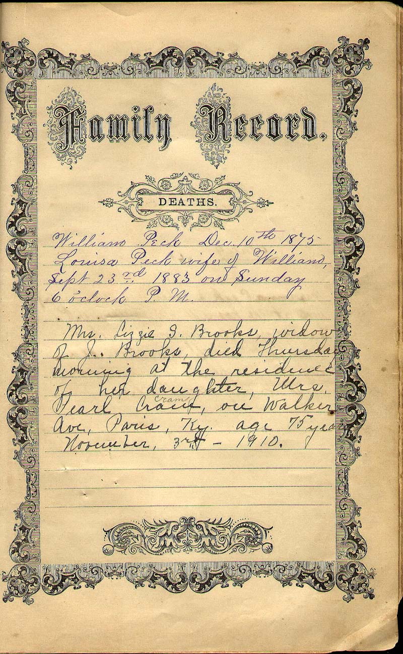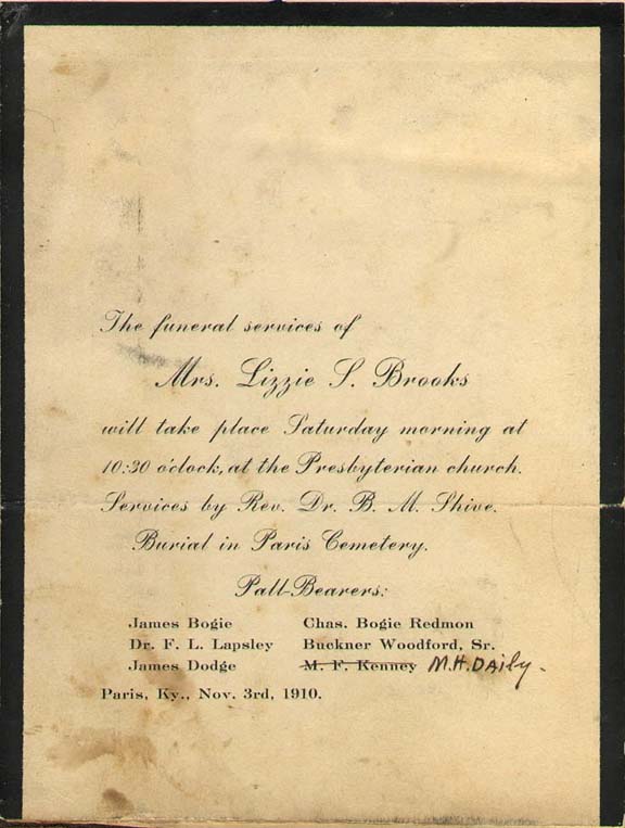Mrs. Lizzie Brooks; 1910 Funeral Notice: Pall Bearers: James Bogle, Dr. F.L. lapsley, James Dodge, Charles Bogie Redmon, Buckner Woodford, Sr., and M. H. Daily (M.F. Kenney crossed out)