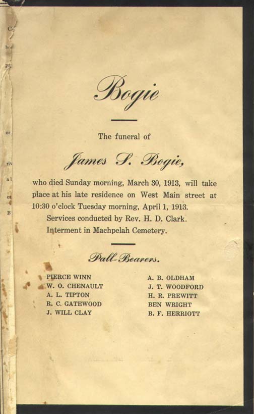 James T. Bogie died 1913: Rev. H.D. Clark; Pall-Bearers: Pierce Winn, W.O. Chenault, A.L. Tipton, R.C. Gatewood, J. Will Clay, A.B. Oldham, J.T. Woodford, H.R. Prewitt, Ben Wright and B.F. Herriott