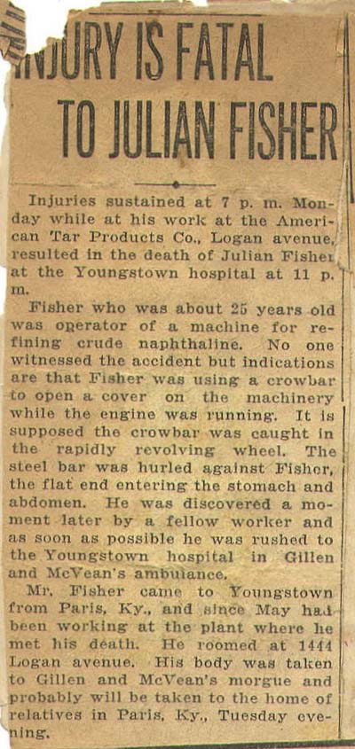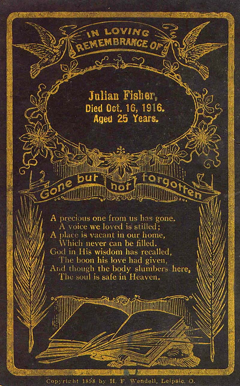 Julian Fisher died; son of William Fisher, sisters: Nannie Belle, Willie and Louise Fisher; grandmother: Mrs. Emma Fisher