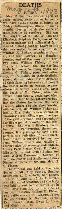 Mrs. Emma Peck Fisher death: dau of William & Elizabeth Stephens Peck; Wife of Wm. H. Fisher; sons Wm. Fisher & Neville C. Fisher; granchildren: Henry Peck Fisher, Owen D. Fisher, Misses Willie and Louise Fisher, Mrs. Alfred Determan; Emily and James Fisher. Pallbearers: James Dodge, George K. Redmon, James Rye, Pearce Paton, Owen L. Davis & Clark Barnett.