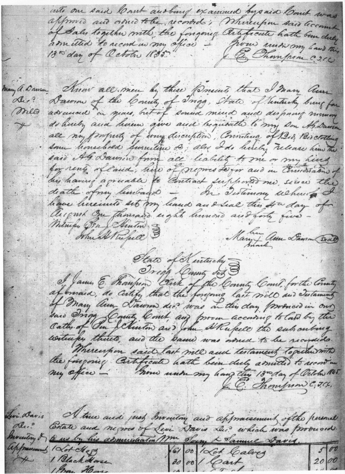 His wife Mary Ann (Clay) died in 1845. In her will (attached) she left the place to her son Augustus Green Dawson, as he had lived in the house and taken care of her.