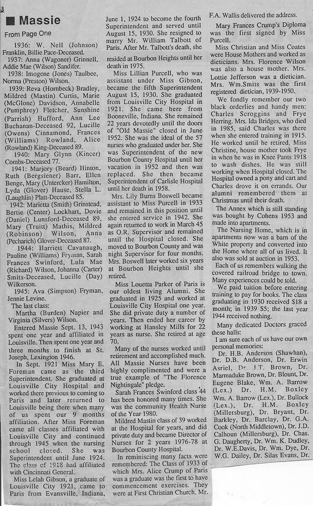 The Kentuckian-Citizen, exact date unknown. The author was Mildred Curtis Mastin, a 1939 graduate of Massie Memorial Hospital nursing program.