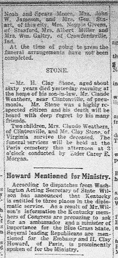 Two children, Mrs. Claude Weathers, of Clintonville, and Mr. Clay Stone, of Virginia survive the deceased. The funeral services will be held at the Paris cemetery this afternoon at 3 o'clock conducted by Elder Carey E. Morgan.