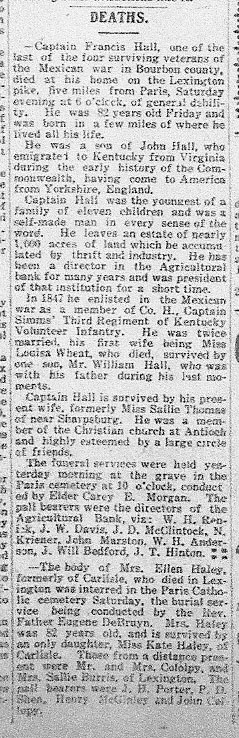 --Captain Francis Hall, one of the last of the four surviving veterans of the Mexican war in Bourbon county, died at his home on the Lexington pike, five miles from Paris, Saturday evening at 6 o'clock, of general debility. He was 82 years old Friday and was born in a few miles of where he lived all his life.