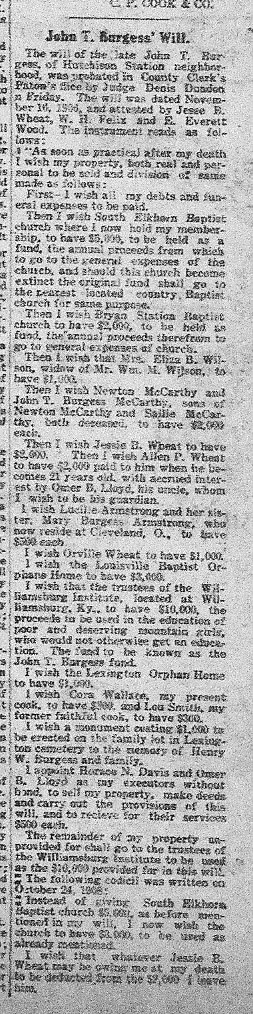 On June 5, 1888, Mr. Talbott was married to Miss Sallie Grimes of Paris, who preceded him to the grave in 1914. He is survived by their five children, Mrs. Wade Hampton Whitley, Mrs. Virgil M. Chapman, Mrs. Virgil Gaitskill, Mrs. George Clayton, and Robert C. Talbott, Jr., all of Bourbon county, and by one brother, Wm. F. Talbott of near Paris, and by two nieces and one nephew.