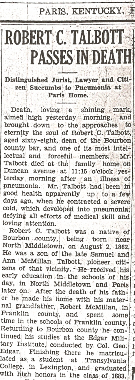 Death, loving a shining mark, aimed high yesterday morning, and brought down to the approaches to eternity the soul of Robert C. Talbott, aged sixty-eight, dean of the Bourbon County bar and one of its most intellectual and forceful members. Mr. Talbott died at the family home on Duncan avenue at 11:15 o'clock yesterday morning after an illness of pneumonia. Mr. Talbott had been in good health apparently up to a few days ago, when he contracted a severe cold, which developed into pneumonia, defying all efforts of medical skill and loving attention.