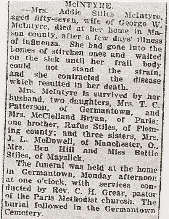 ---Mrs. Addie Stiles McIntyre, aged fifty-seven, wife of George W. McIntyre, died at her home in Mason county, after a few days illness of influenza. She had gone into the homes of stricken ones and waited on the sick until her frail body could not stand the strain, and she contracted the disease which resulted in her death.