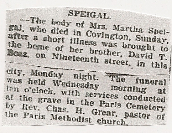 ---The Body of Mrs. Martha Speigal, who died in Covington Sunday, after a short illness was brought to the home of her brother, David T. Boaz, on Nineteenth street, in this city, Monday night. The funeral was held Wednesday morning at ten o'clock, with services conducted at the grave in the Paris Cemetery by Rev. Charles H. Grear, pastor of the Paris Methodist Church.