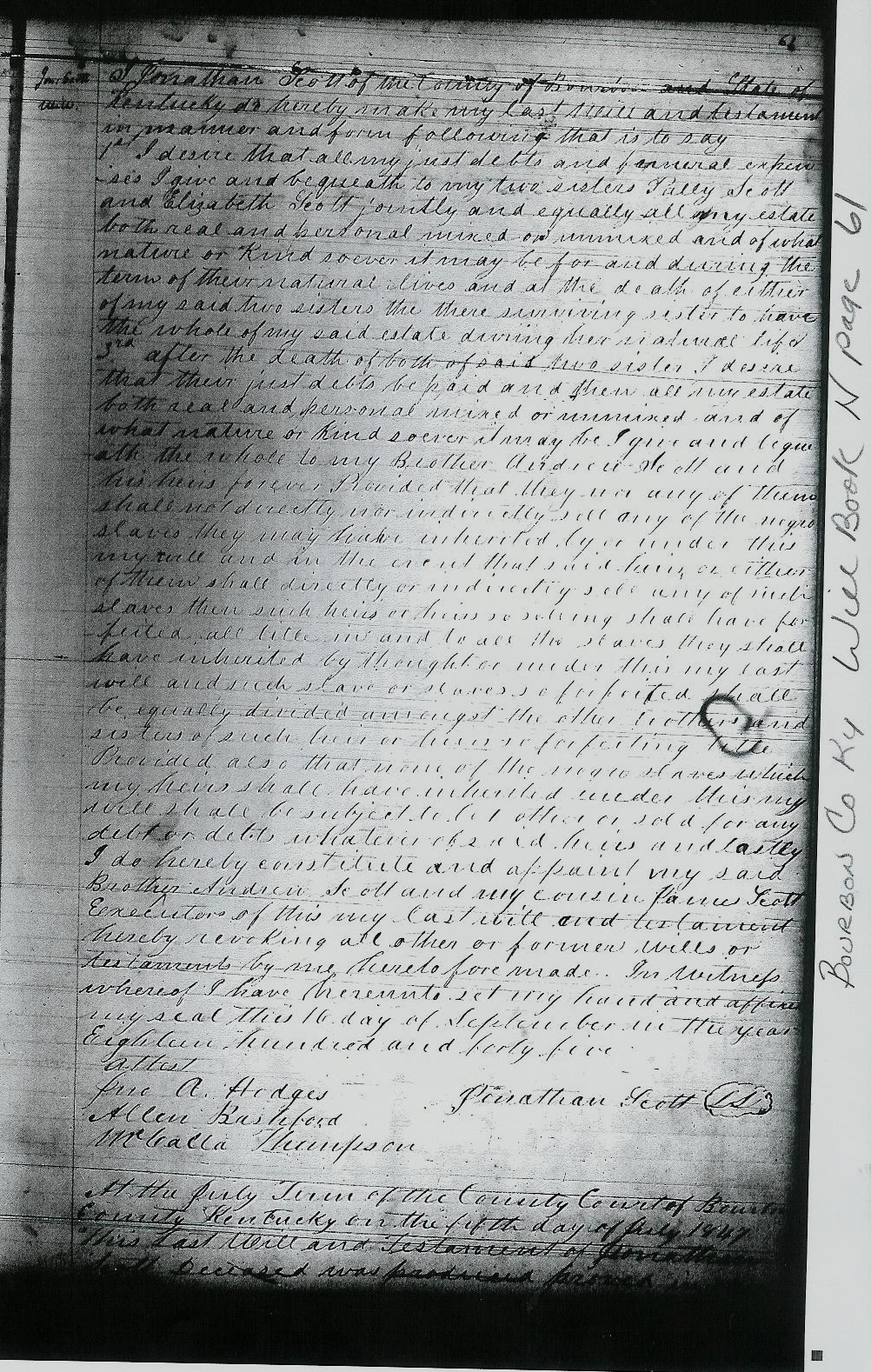 At the July term of the County Court of Bourbon County Kentucky on the fifty day of July 1847 This last Will and Testament of Jonathan Scott deceased was produced proved in ��