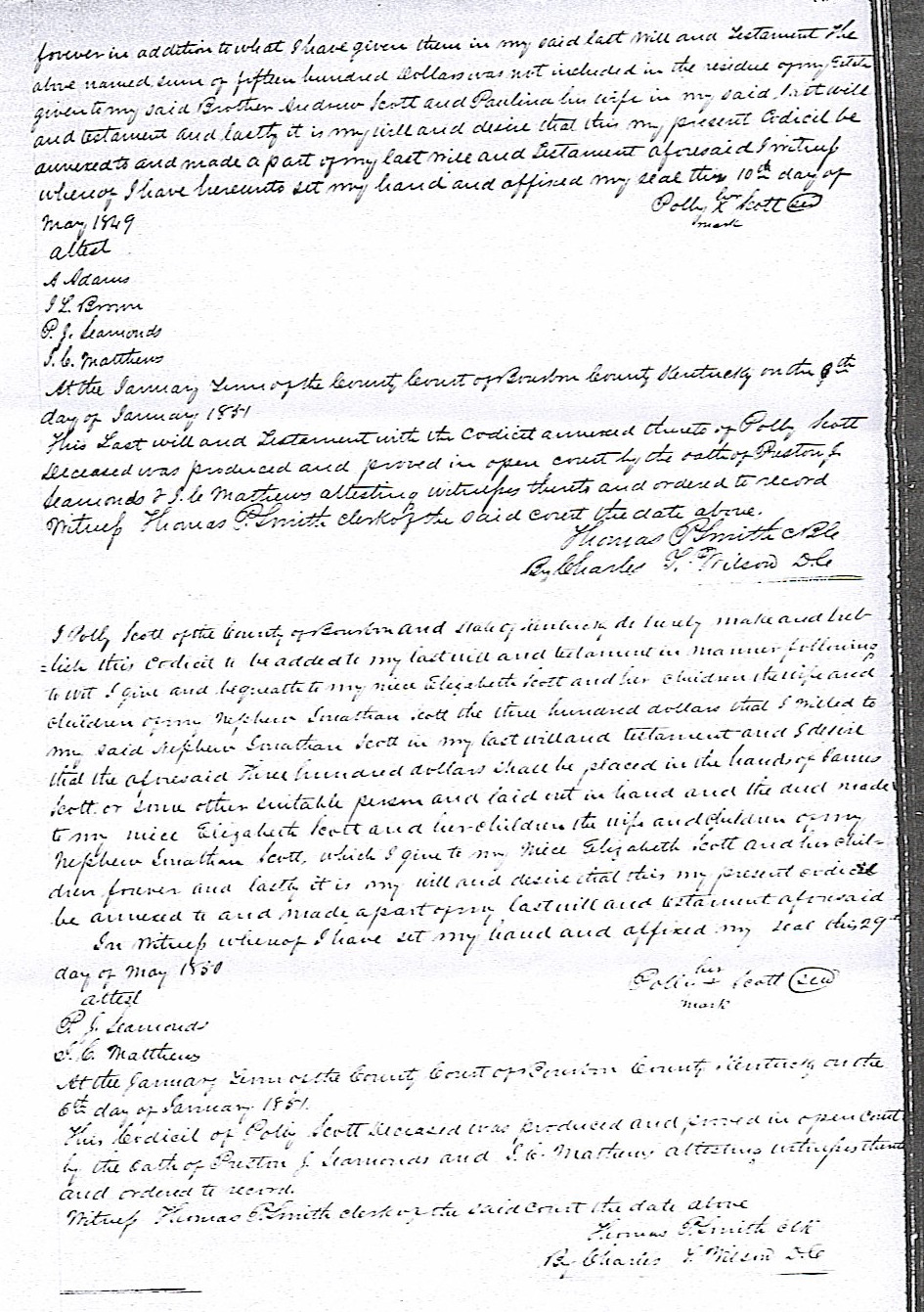 At the January Term of the County Court of Bourbon County Kentucky on the 6th day of January 1851. This last will and testament with the codicil amended thereto of Polly Scott deceased was produced in open court by the oath of Preston J. Seamonds and J.C. Matthews attesting witnesses thus and ordered to record. Witness Thomas P. Smith, clerk of said court the date above.