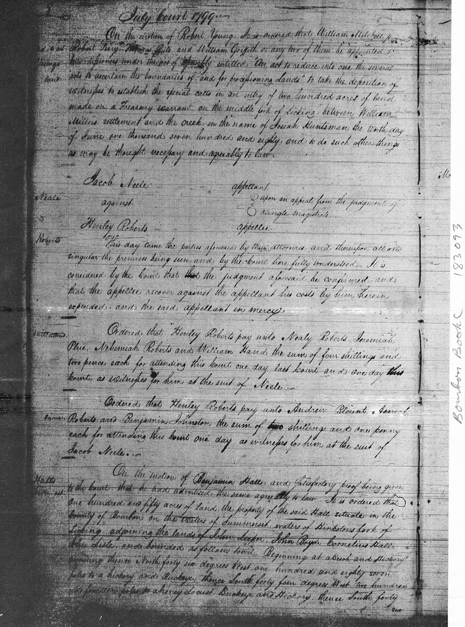 1799 Henley Roberts to pay Nealy Roberts, Jeremiah Plue, Nehemiah Roberts, William Hand for testimony in suit of Jacob Neale; also to pay Andrew Blount, Asariah Roberts, and Benjamin Johnston. Case papers not found.