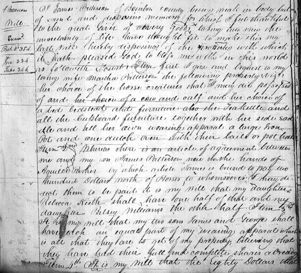 In the name of God amen, I William Scott of the County of Bourbon, State of Kentucky being weak in body but of sound and disposing mind and memory do make and publish this as my last will and testament hereby revoking all others.