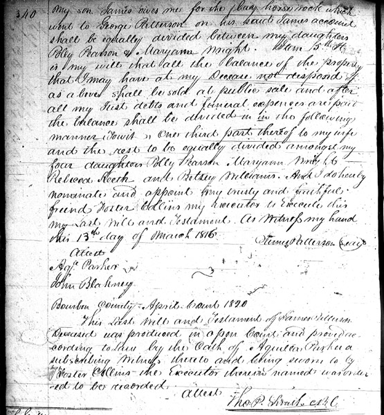 Specific bequests to his wife Martha including a horse, choice of cow & calf, choice of bed and furniture and specific pots. Names sons James and George and married daughters Rebecca Keith, Betsy Williams, Polly Pearson, and Mary Ann Wright . Foster Collins was appointed Executor. Will signed 13 March 1816