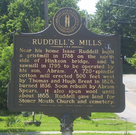 Near his home Isaac Ruddell built a gristmill in 1788 on the north side of Hinkson bridge, and a sawmill in 1795 to be operated by his son, Abram. A 720-spindle cotton mill erected 500 feet west by Thomas and Hugh Brent in 1828, burned 1836. Soon rebuilt by Abram Spears, it also spun wool until about 1855. Ruddell gave land for Stoner Mouth Church and cemetery.