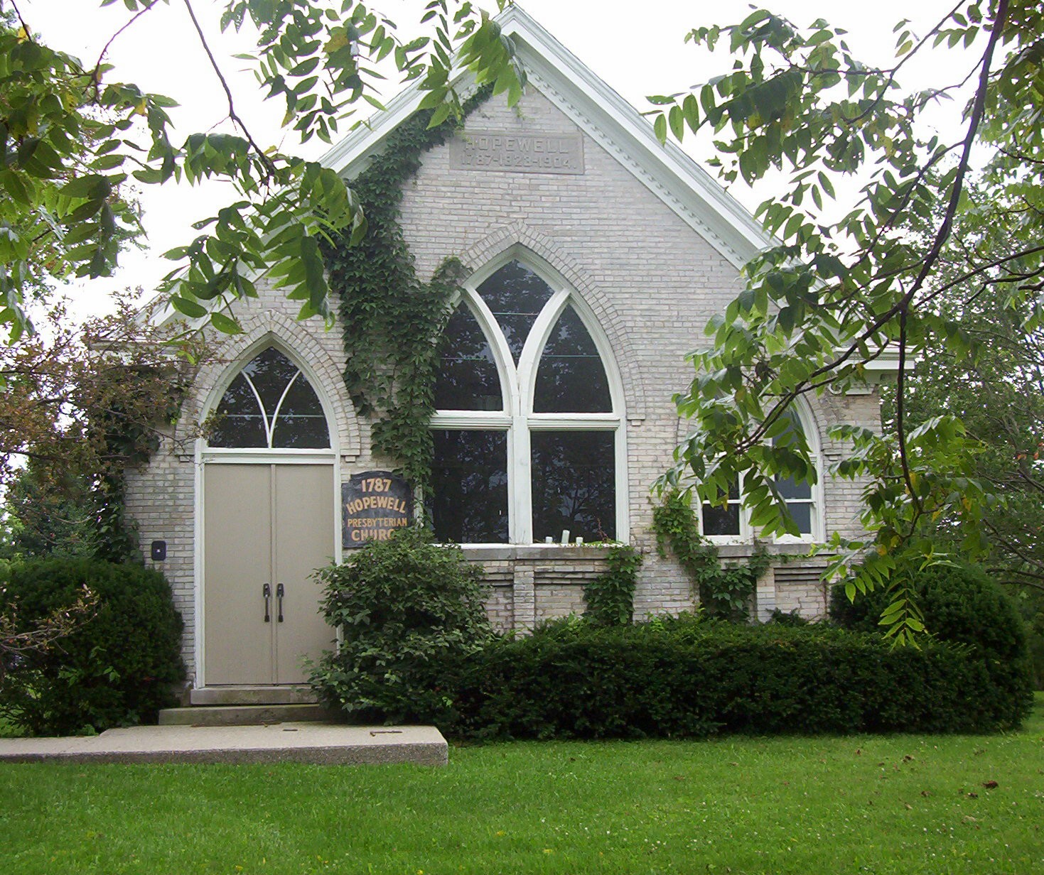 Hopewell, one of the oldest Presbyterian churches in Bourbon County, has held worship services since 1785. The first congregation included Dutch settlers. It was recognized by the Transylvania Presbytery in 1787. Original church was located near Grant's Fort, one mile from this site. After fort and church burned, the church was rebuilt here in 1823 and in 1904.