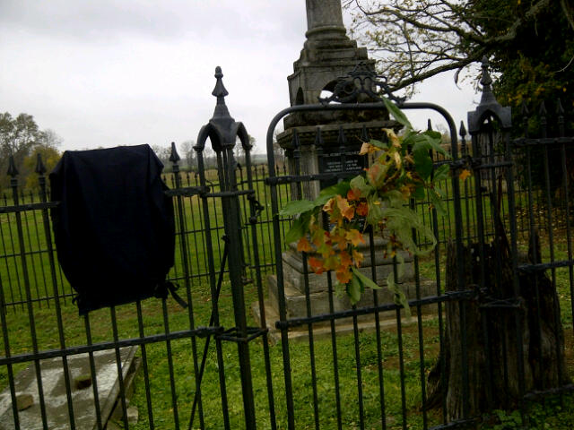 Robert Wilmott is buried in the Hutchinson Precinct, at his home place now owned and occupied by a descendant, Ike Wilmott. The grave is located in the yard of the home and is marked by a monument erected by his son J. T. Wilmott. Inscription "Col. Robert Wilmott was born Dec. 25, 1757 in Maryland near Baltimore and joined the Revolutionary Army in 1776 and remained five years. Married Pricilla Dorsey on April 17, 1781. They moved to Bourbon County in 1792. He represented this county seven years as a member of the convention. Died Aug. 5, 1859. Mrs. Priscilla Wilmott died April 9, 1811 in the 52nd year of her age". Below are photos from the grave marking held by the DAR on 28 Oct. 2012.