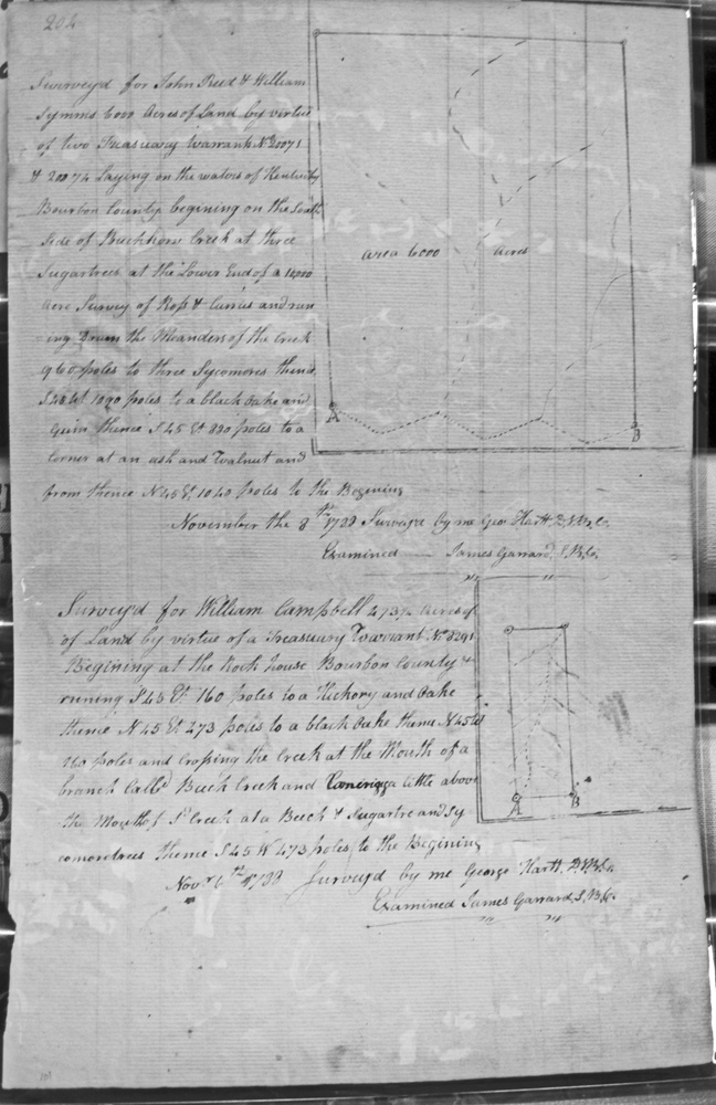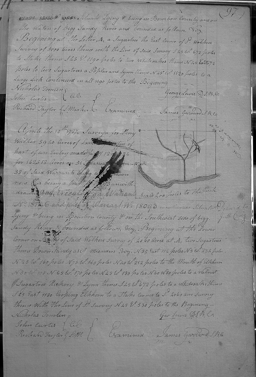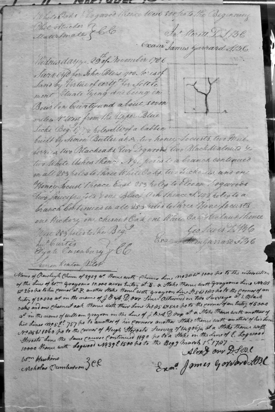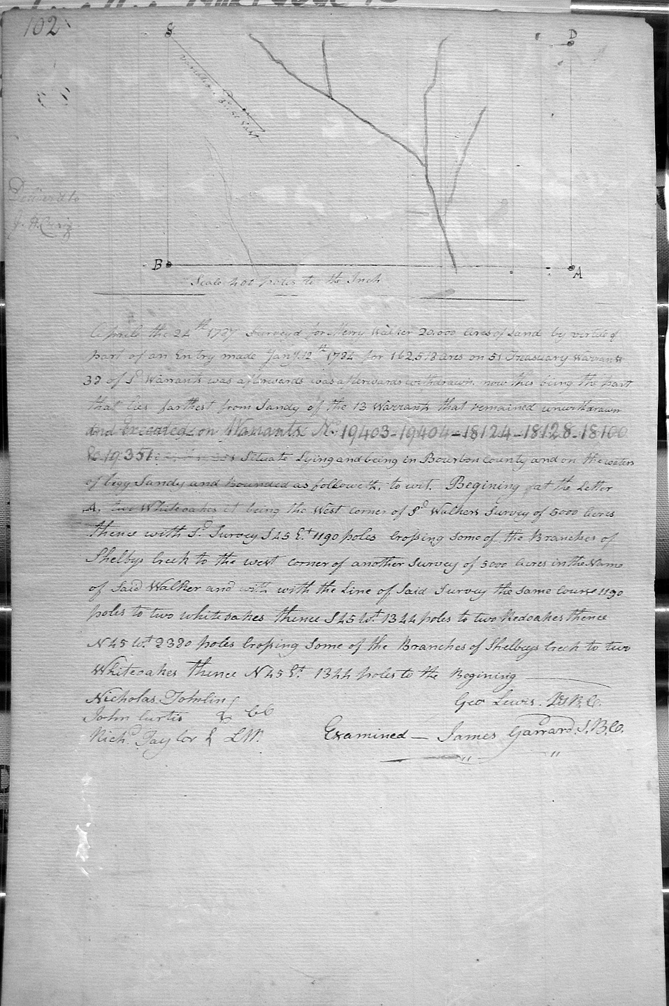 On the waters of Bigg Sandy and on the lines of Sd. Walkers 5,000 acre surveys, crossing Shelby's creek to another of said Walker's 5,000 acre survey..