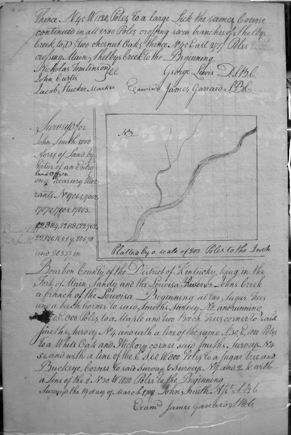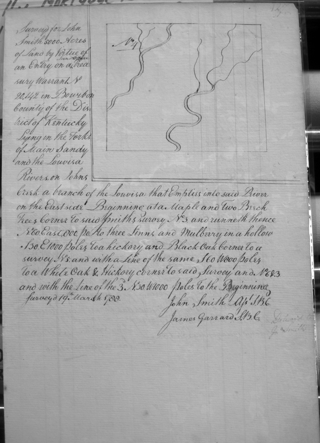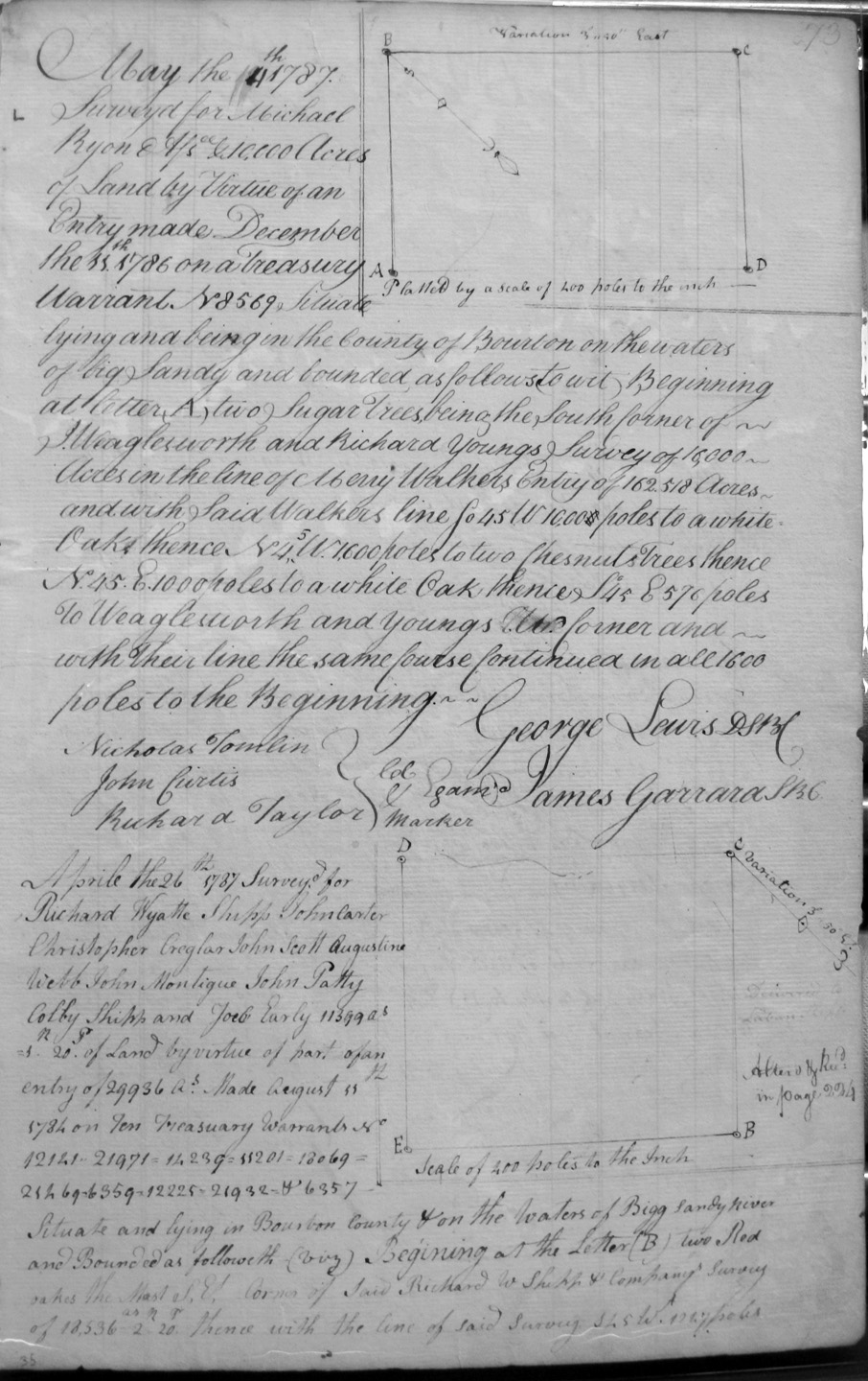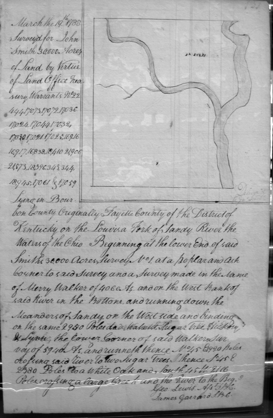 On the Bigg Sandy River, on the lines of Merry Walker's 162,513 (?) acre survey, crossing Shelby's creek, along the meanders of Bigg Sandy & the mouth of Shelby's creek.