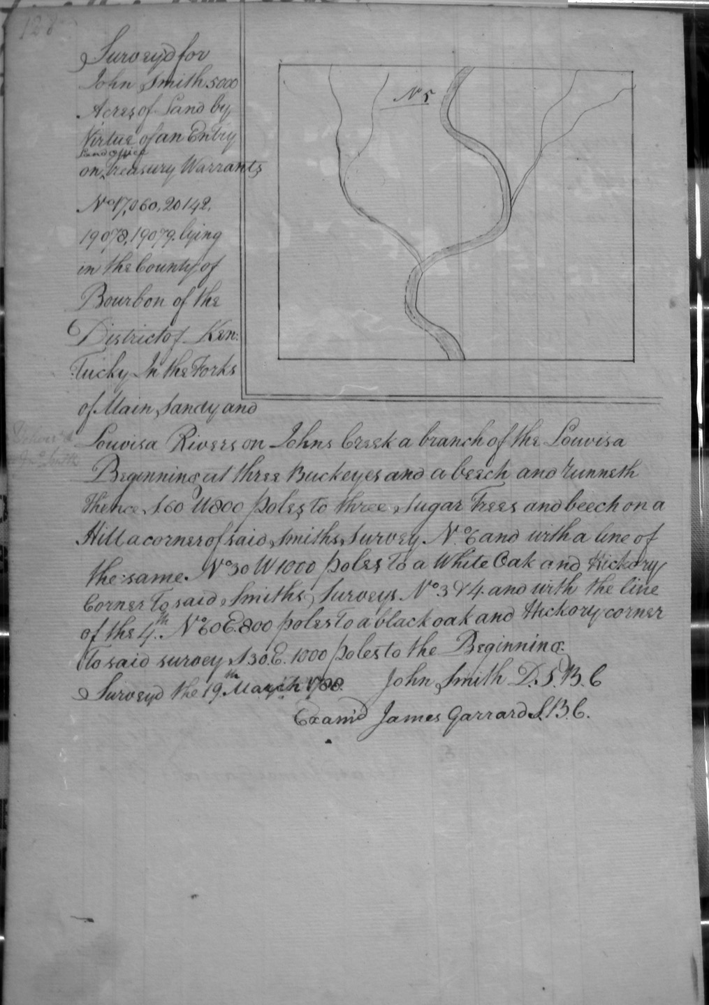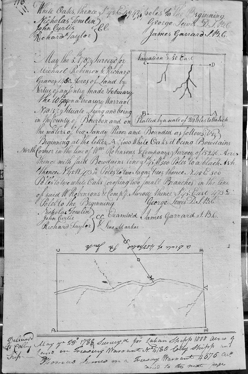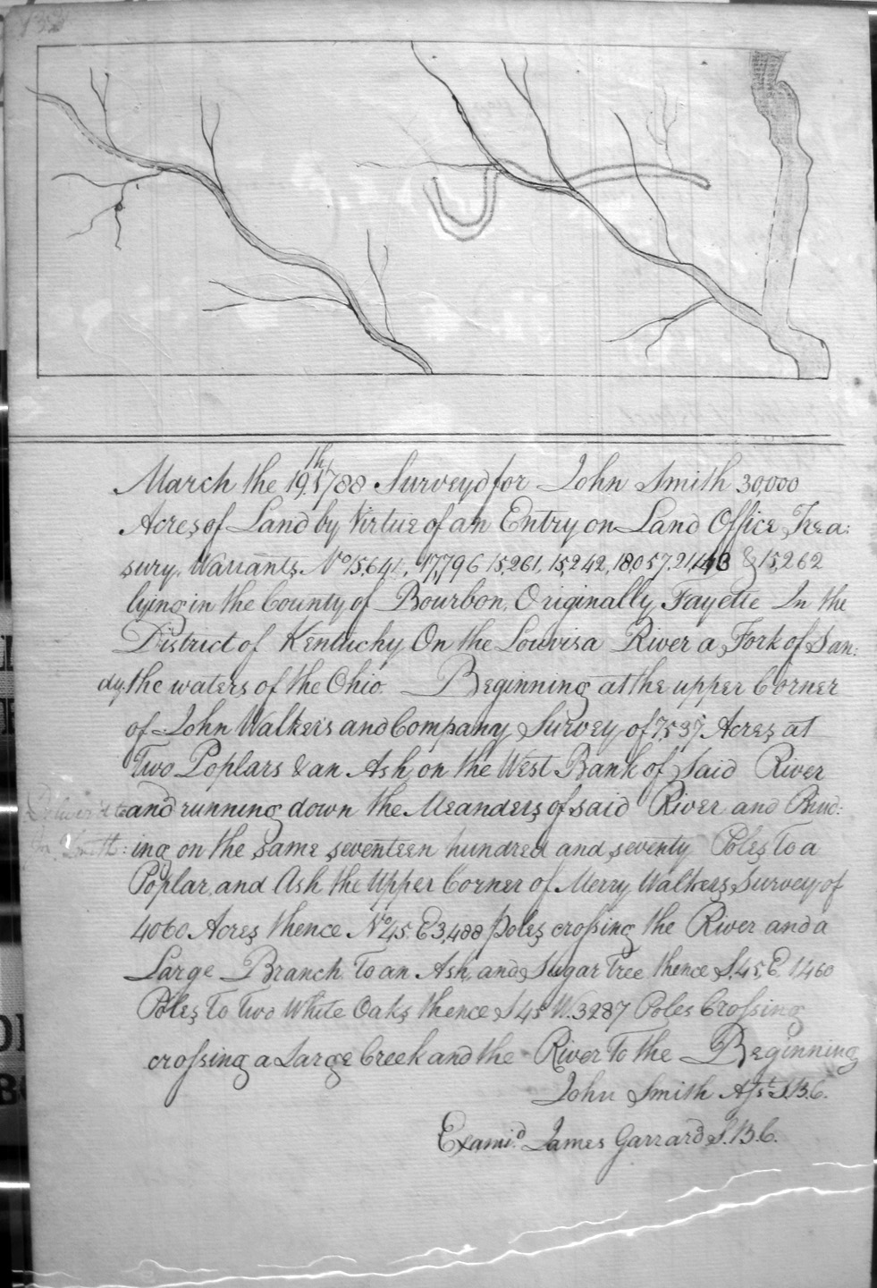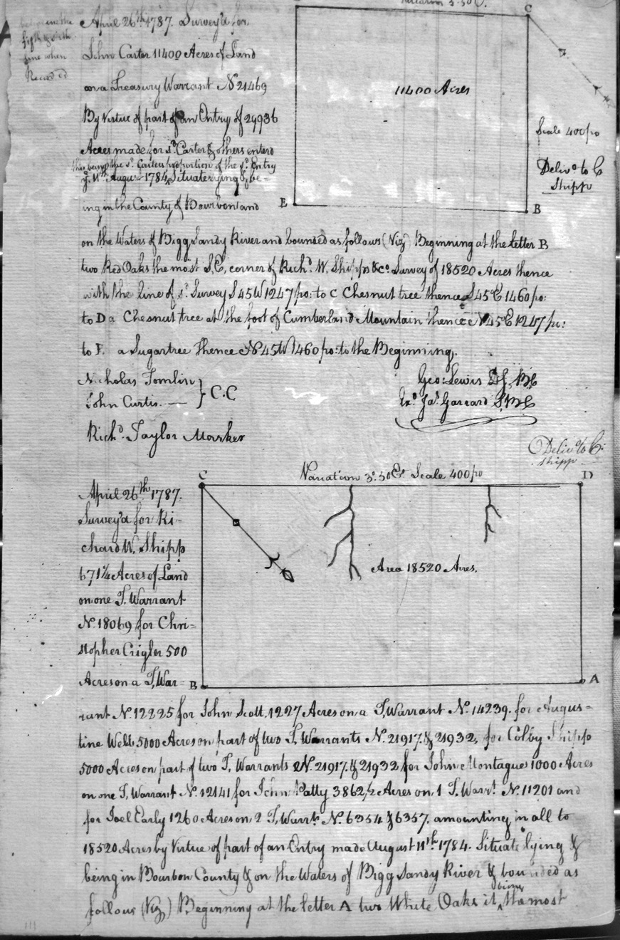 On the Bigg Sandy River, on the lines of Merry Walker's 162,513 (?) acre survey, crossing Shelby's creek, along the meanders of Bigg Sandy & the mouth of Shelby's creek.