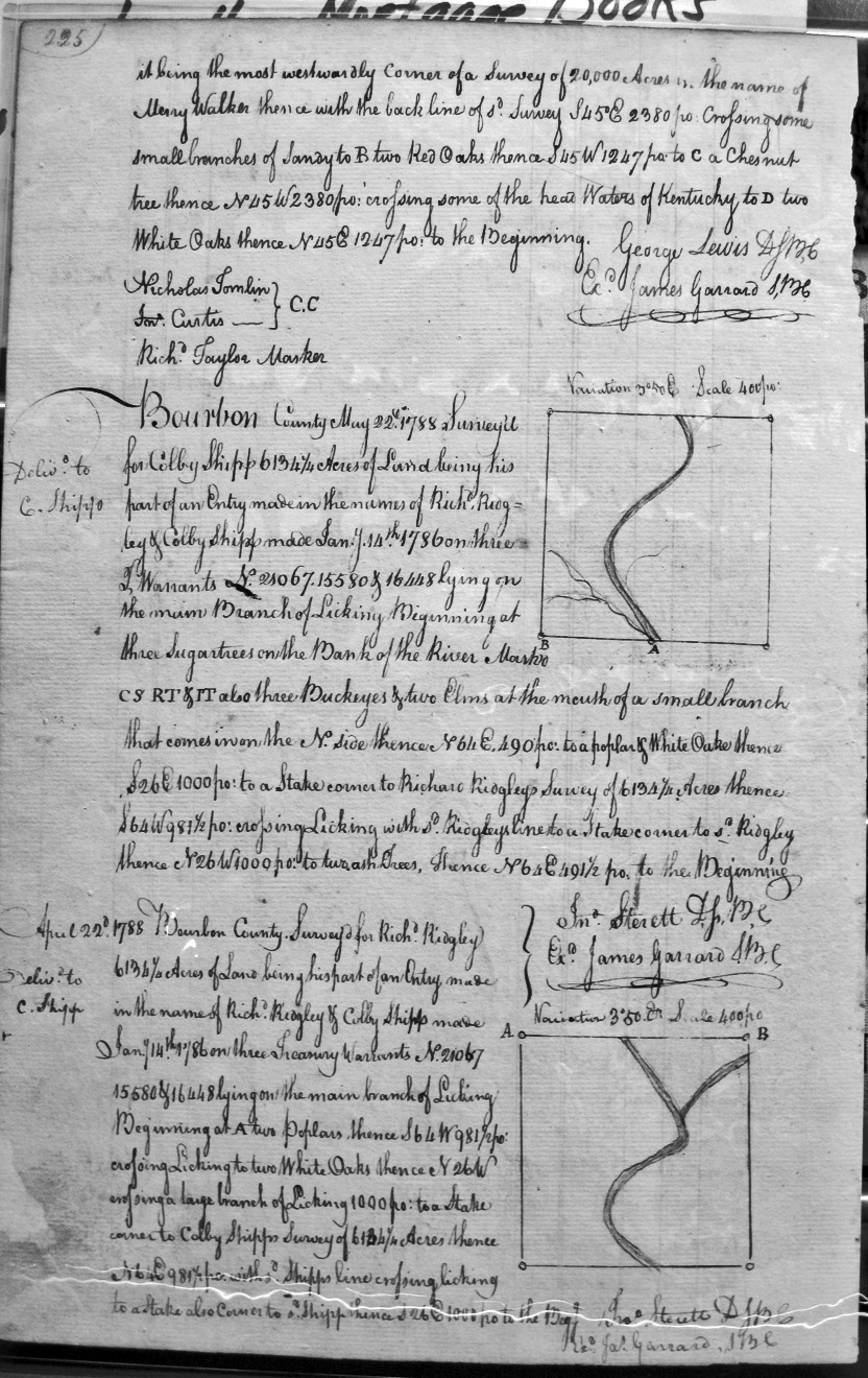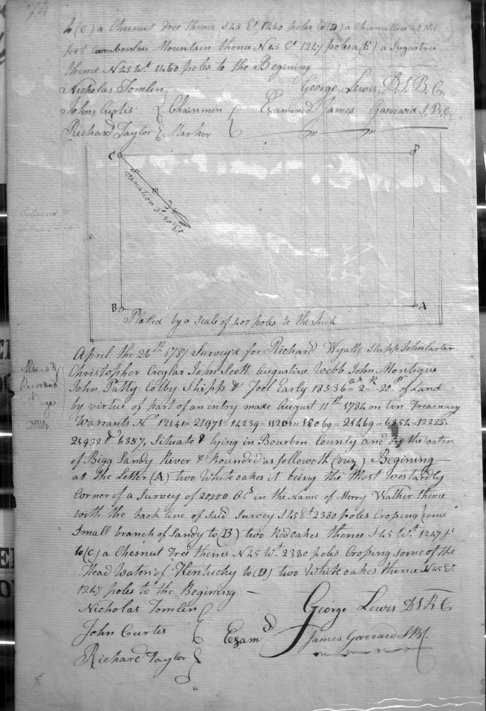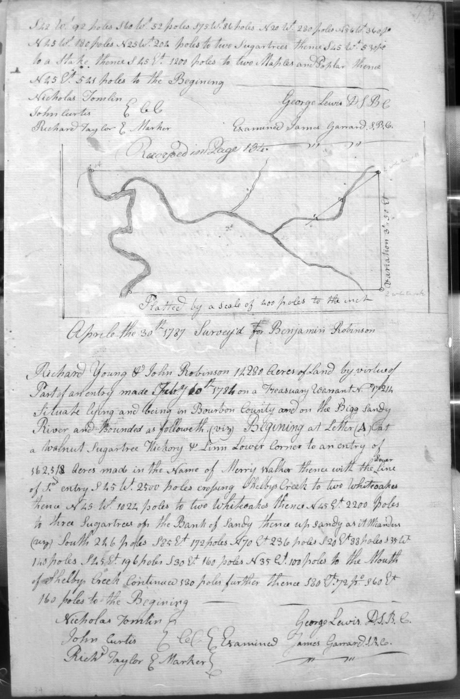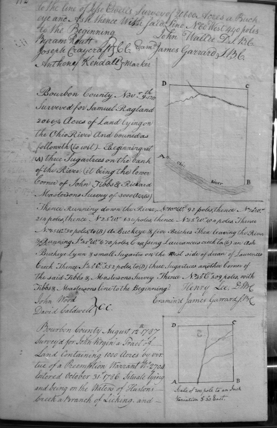 On the Bigg Sandy River, on the lines of Merry Walker's 162,513 (?) acre survey, crossing Shelby's creek, along the meanders of Bigg Sandy & the mouth of Shelby's creek.