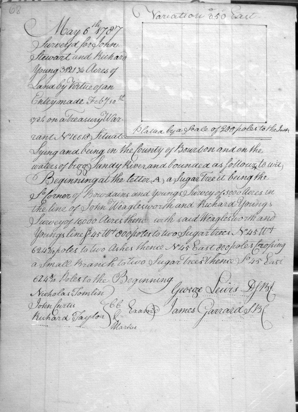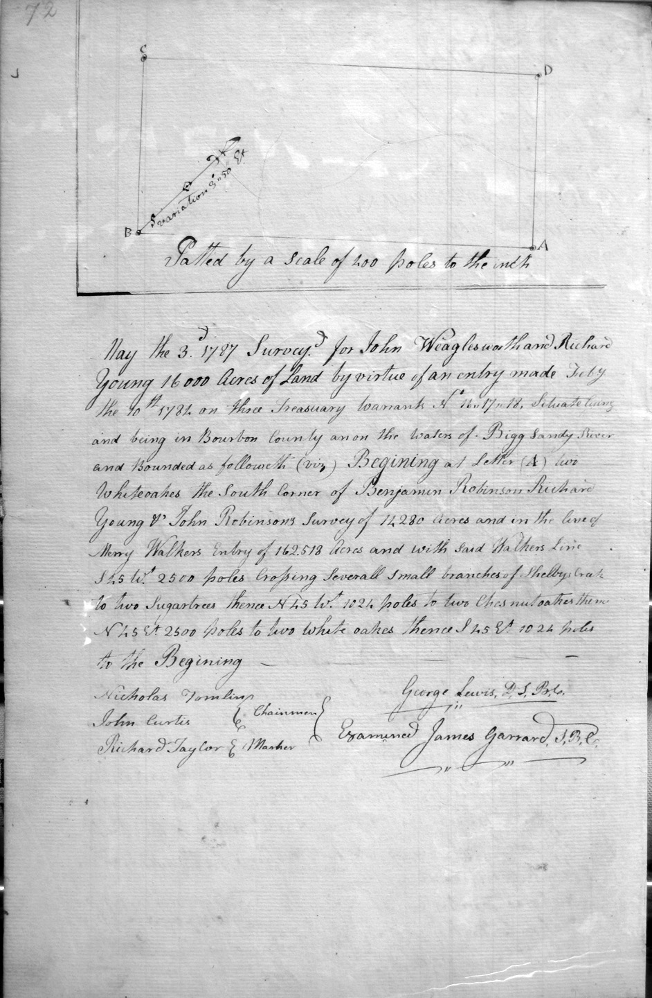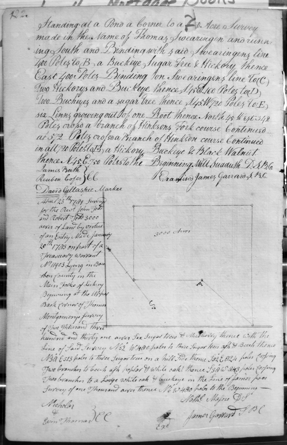 On the waters of Bigg Sandy on the lines of John Steward and Richard Young's survey of 3121 acres and of John Waglesworth and Richard Young's 16000 acre survey, and Michael Ryan's 10,000 acre survey.