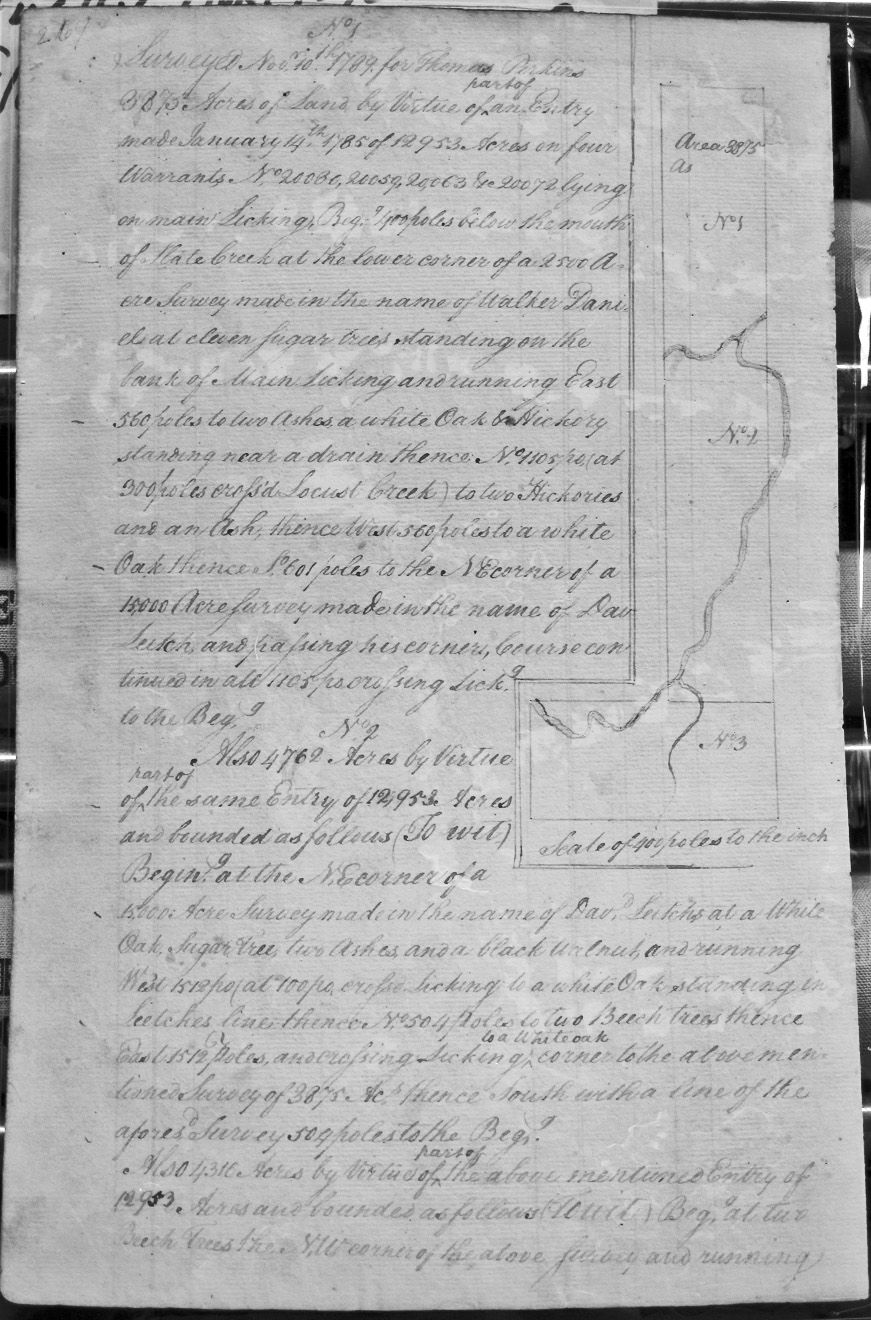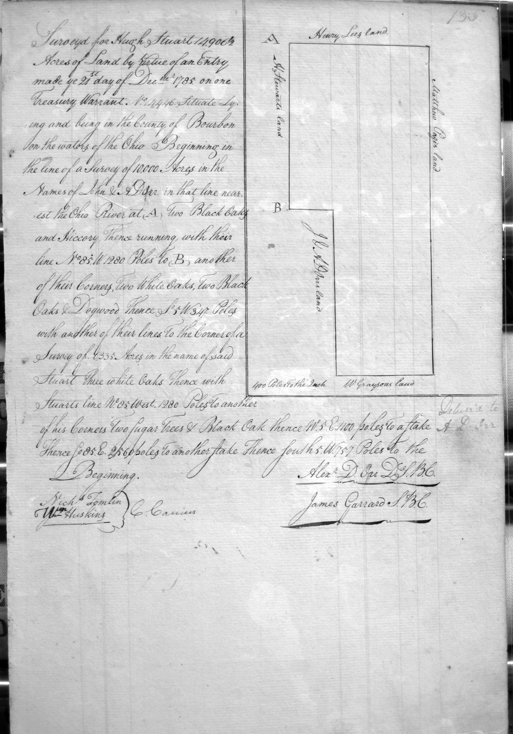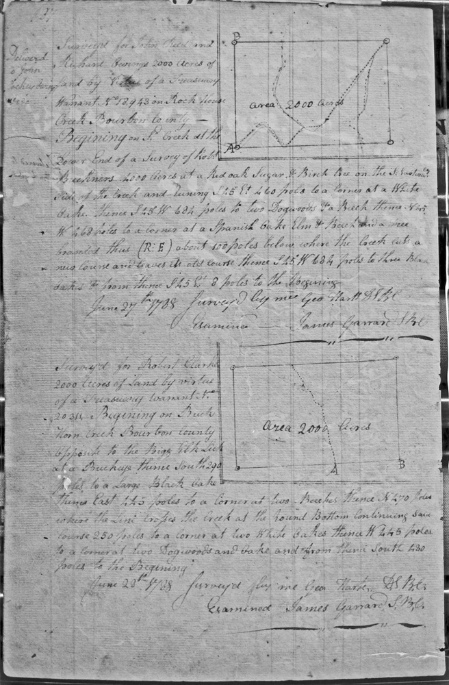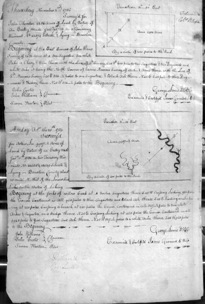 4762 acres By virtue of the same warrant, and on the NE corner of a 15,000 acre survey made in the name of David Leitch, and crossing Licking twice before meeting the above mentioned survey.