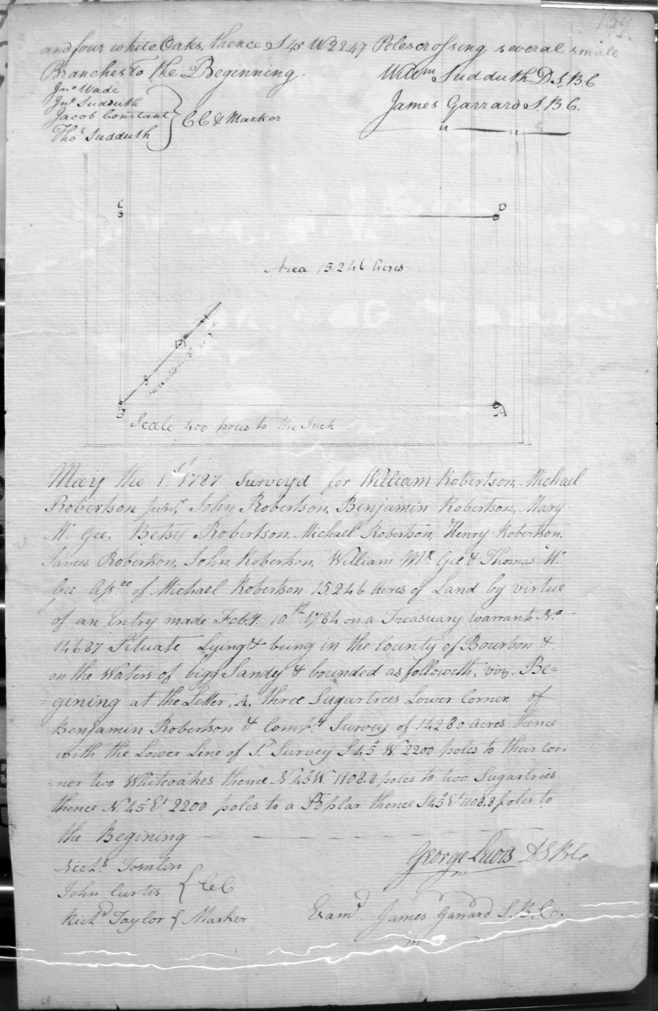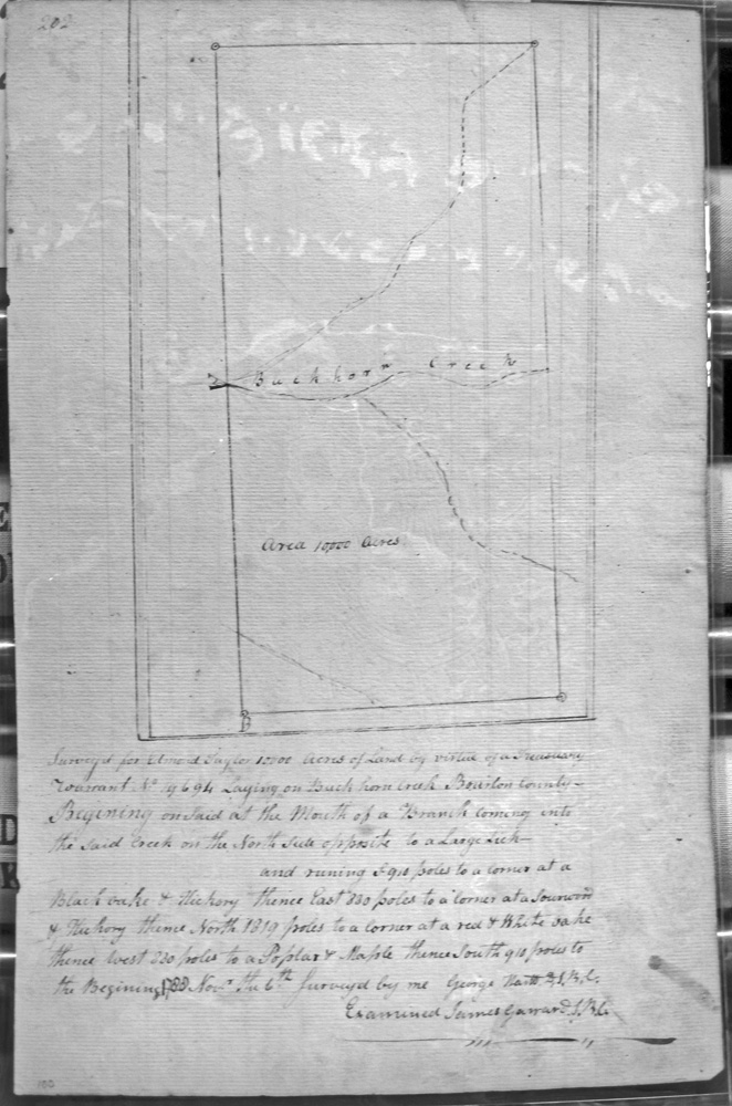 On the waters of Greens Creek and McMillions branch, and bounded by an Elm in Parberry's line, with Henty Clays line and his corner with Christopher Zumwalt, and with Samuel Clays line. Surveyed by Charles Smith Jun. and Marker Christopher Zumwalt, and chain carriers Edmund and James Hord.