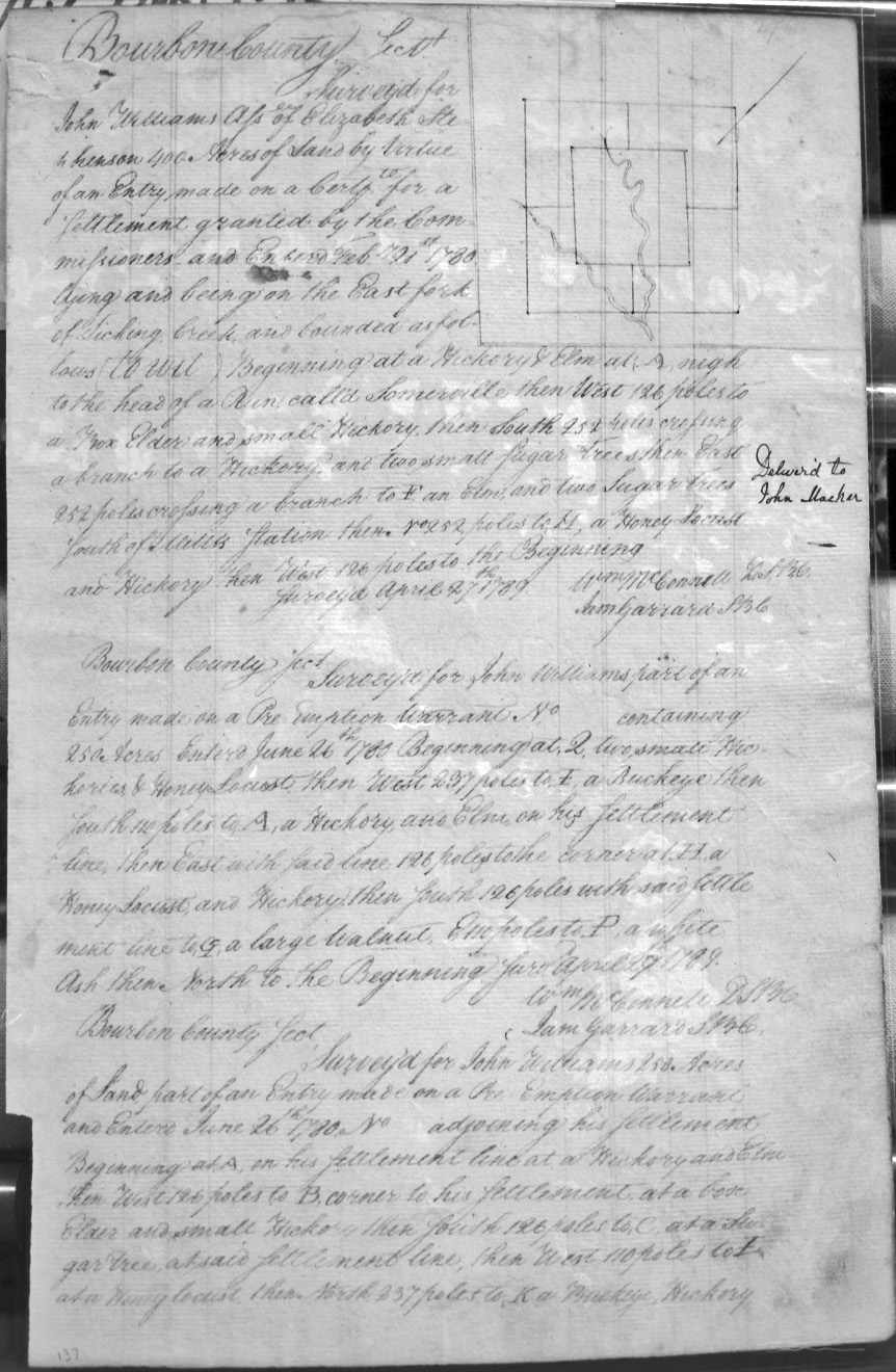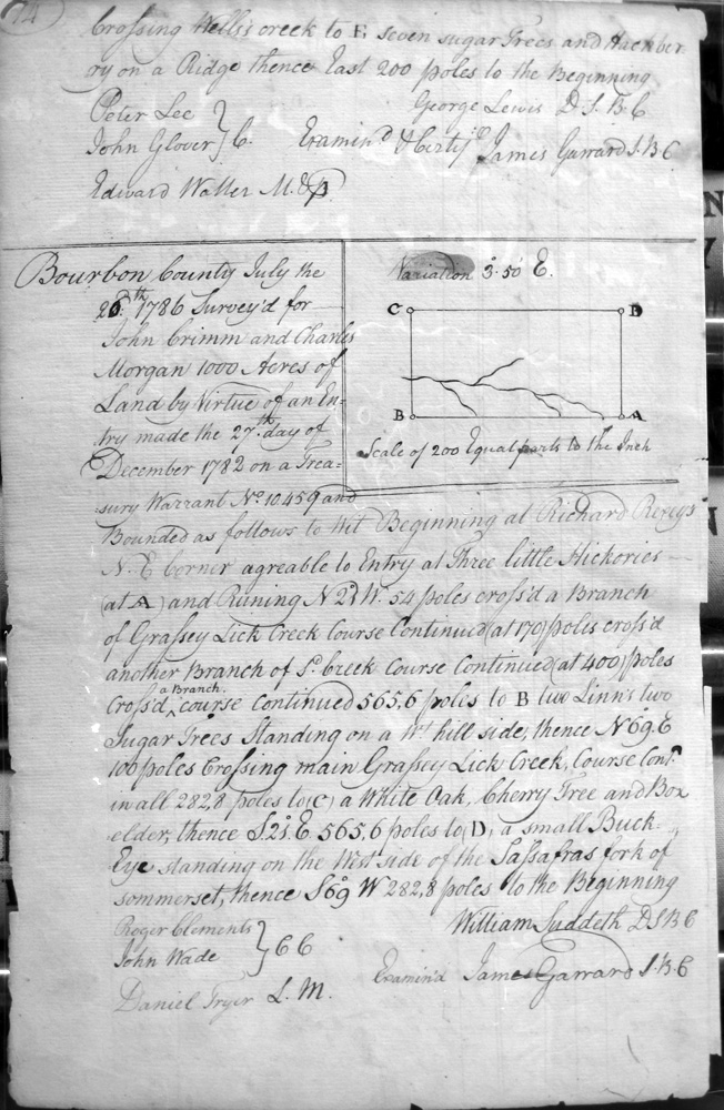 On the Main branch of Licking adjoining the lower side of the 3,150 acre survey of Richard Young, Assignee of Jonathan Wilson that lies on the South side of the creek, cornering on Richard Young's two surveys of 3,150 each, and crossing the creek three times.