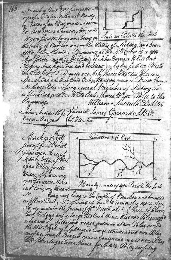 On the north side of main Licking opposite the mouth of Slate Creek, on the meanders of Licking and crossing Licking, crossing a branch several times, and on Licking Bottom.