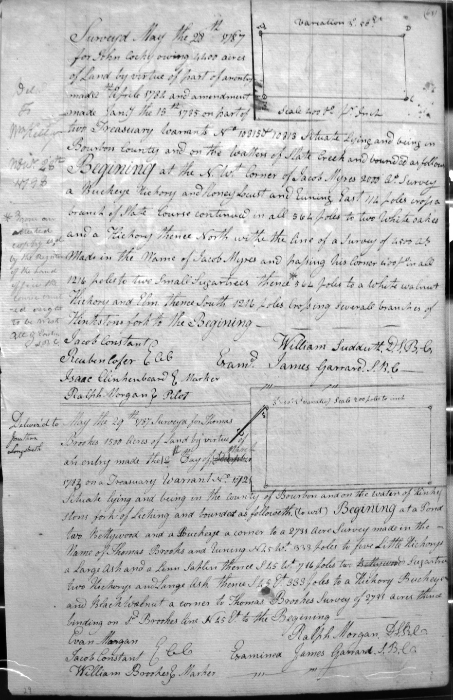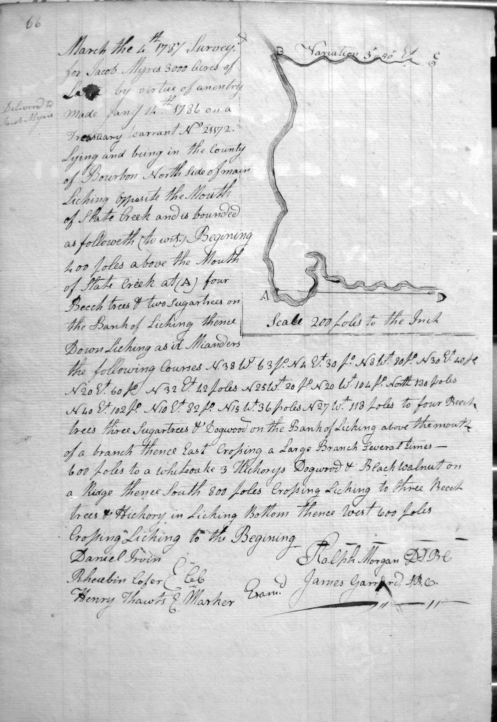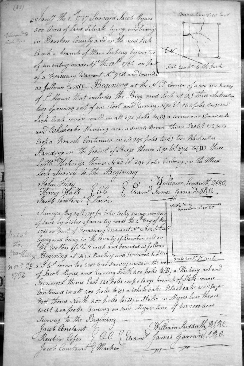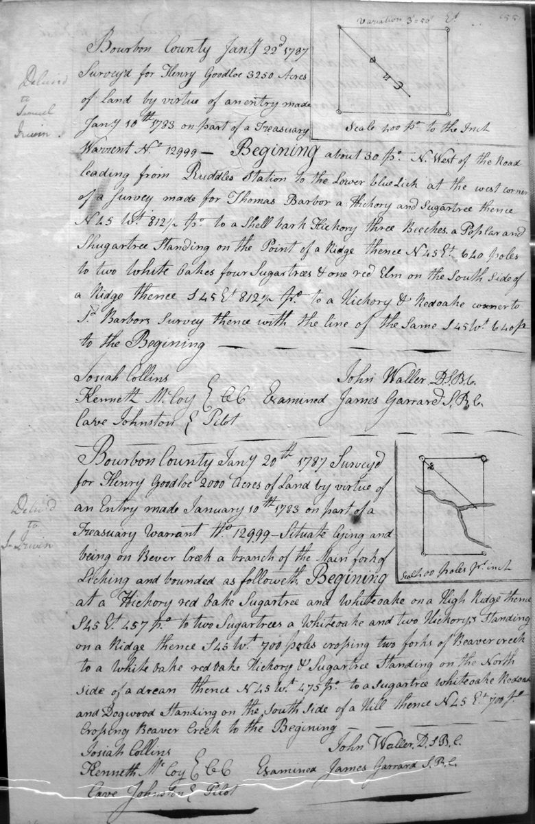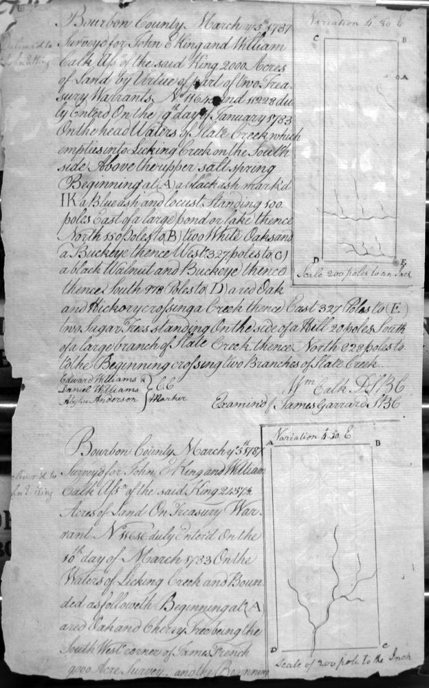 On the waters of Slate Creek and Jacob Myars 2,000 acre survey, Myars 4,500 acre survey, and crossing several branches of Hinkston's fork.