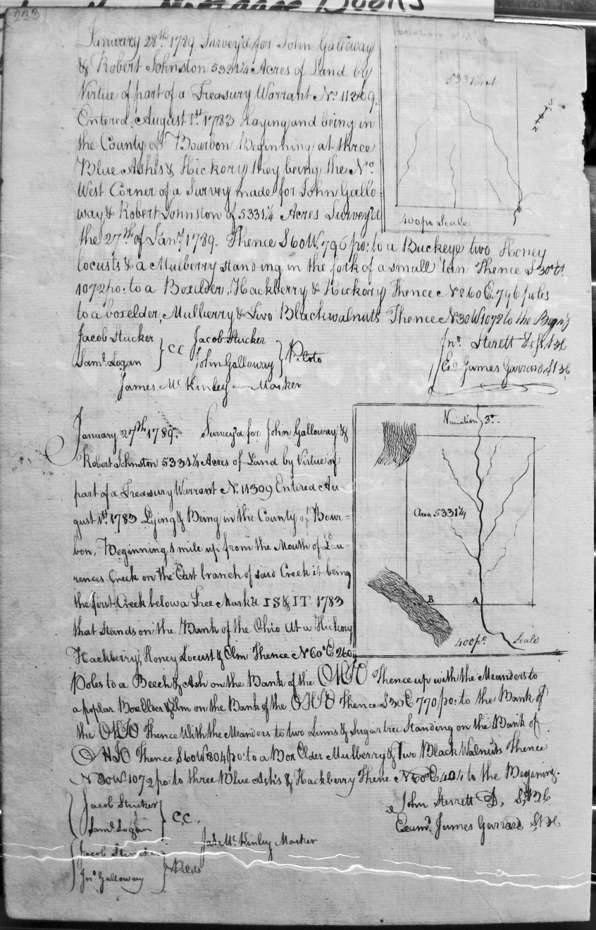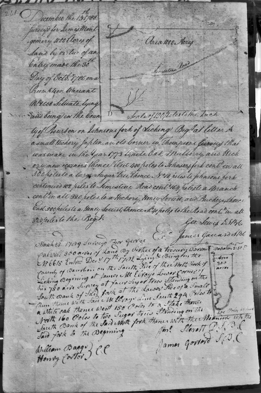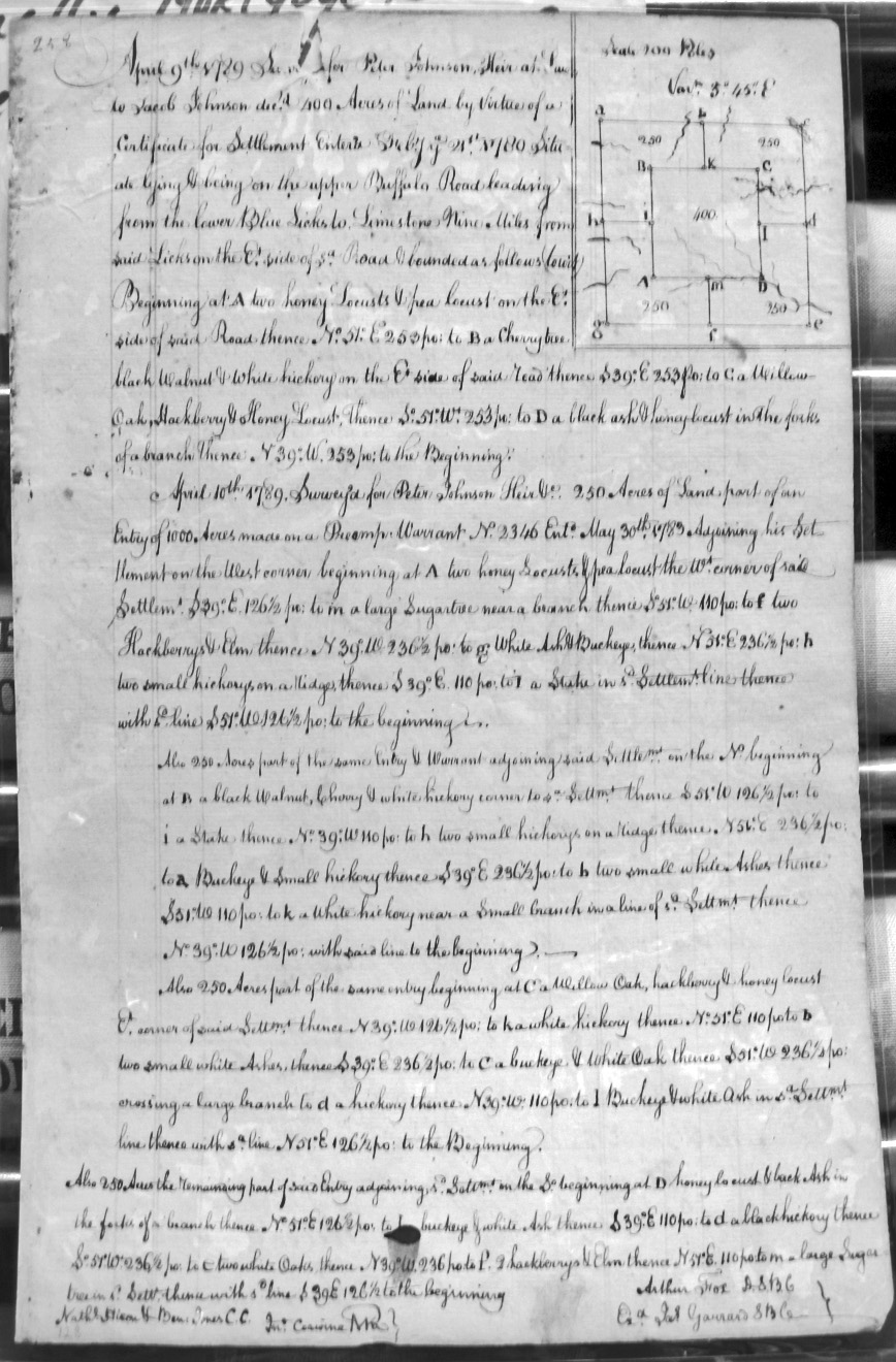 On Johnsons Fork of Licking, bounded by an old corner in Thompson's 1773 survey, Johnson's fork, and the Limestone Road.