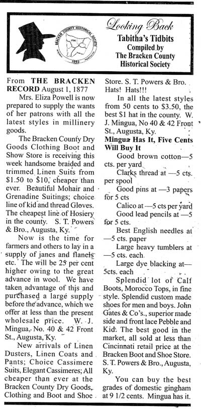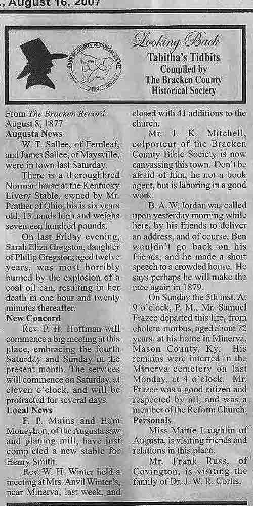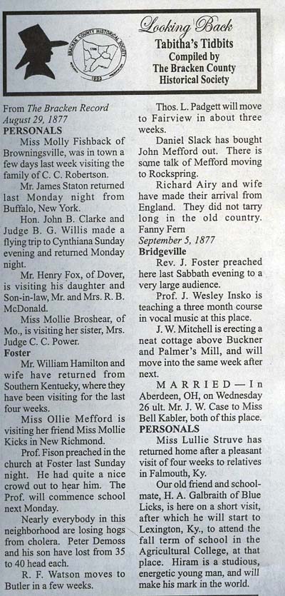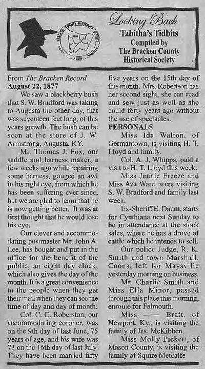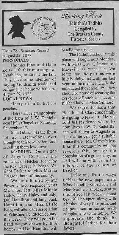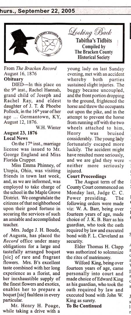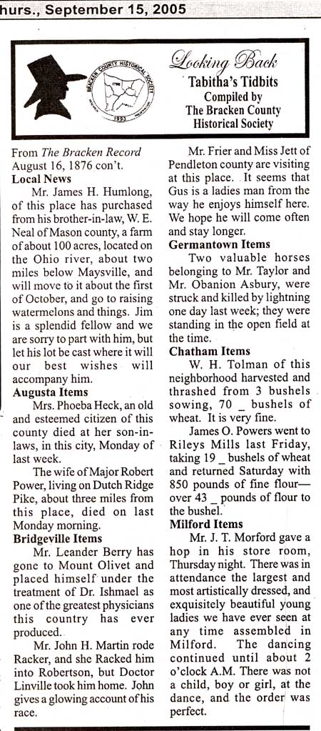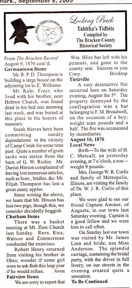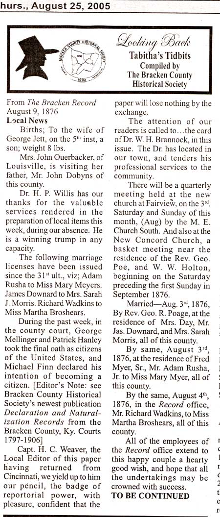 | August 25, 2005 | From The Bracken Record August 9, 1876 |