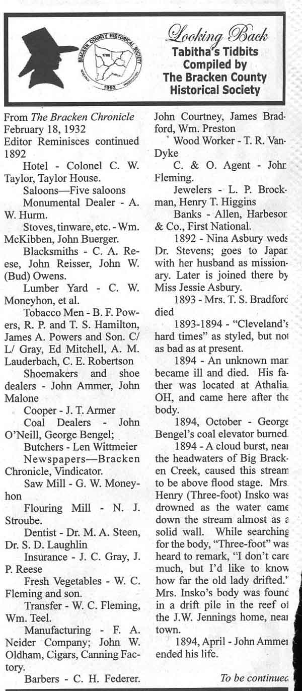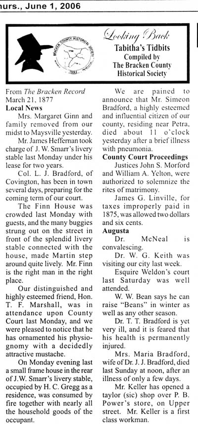 June 30, 1976 Many Bracken County Communities Were Flourishing At One Time Whitfield Craig Doctor Doniphan Charles Patterson Tanners [business] Jessie Grant Hannah Simpson Ulysses [Grant] |