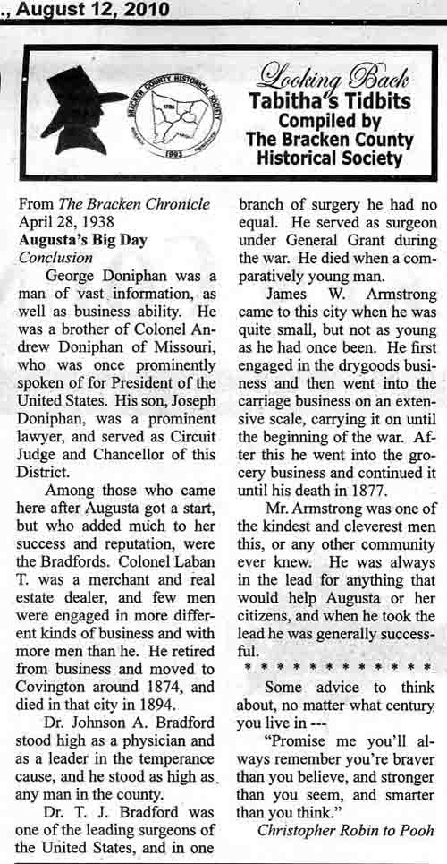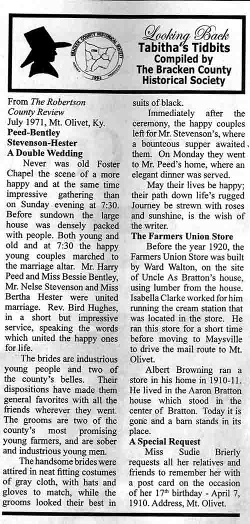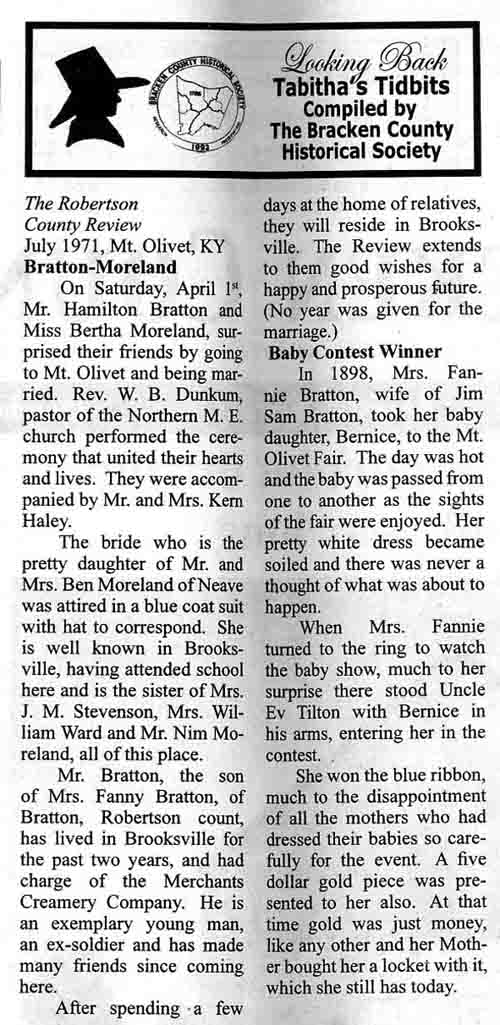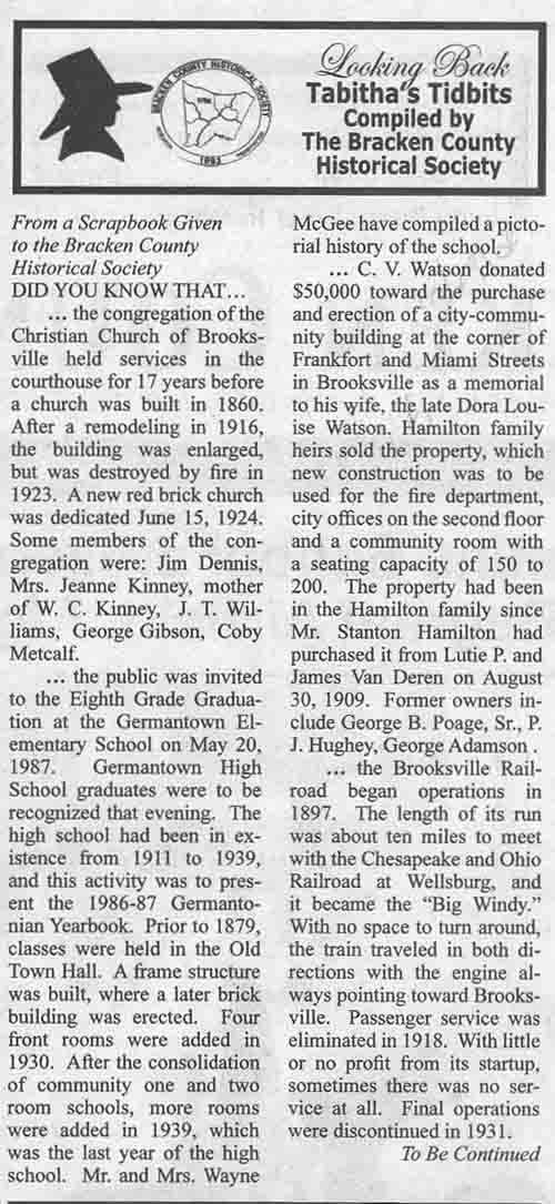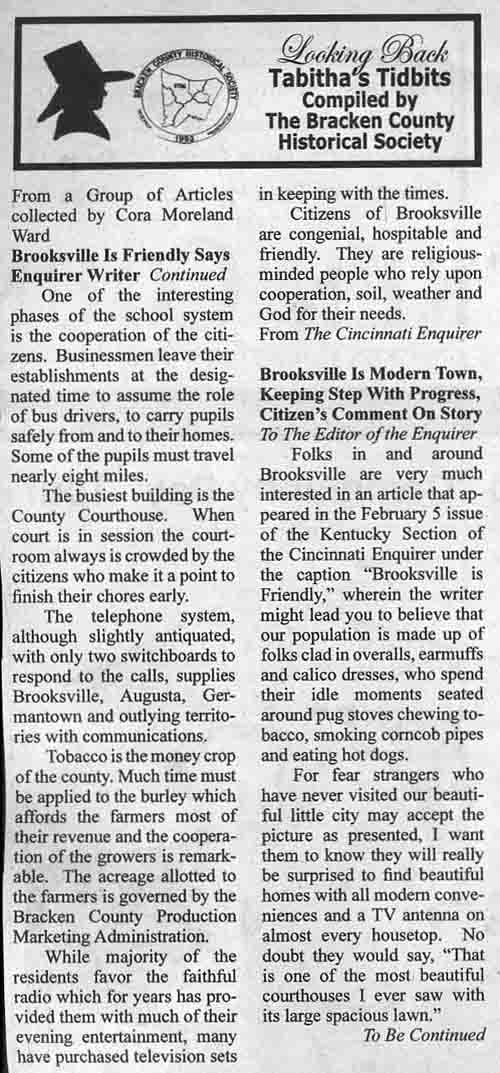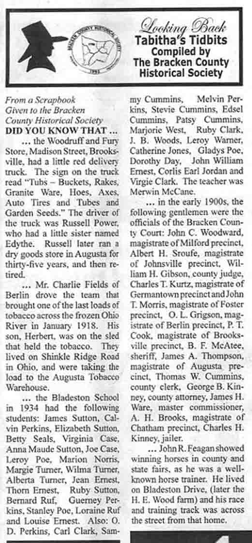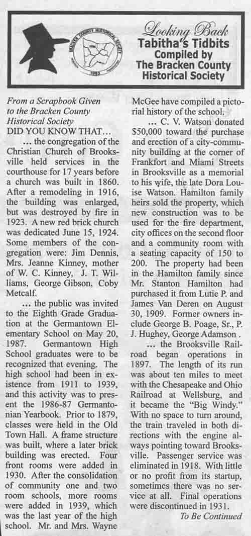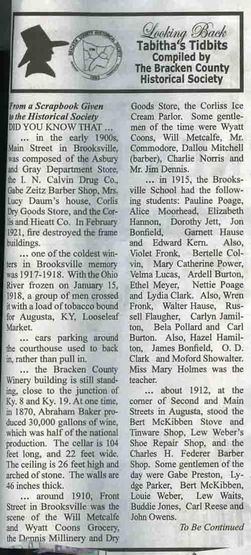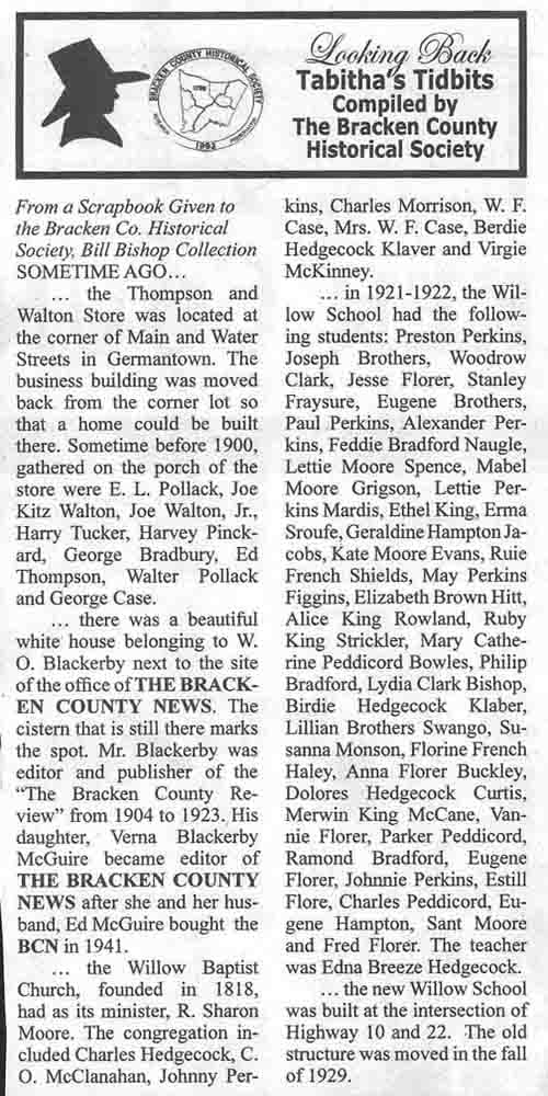 | Published weekly in the Bracken County News All materials on this website are displayed with the express written permission of The Bracken County News. To subscribe, call (606) 735-2198 or send $15 (Bracken County), $20 (Kentucky), $25 (Out-of-State) to: The Bracken County News, P.O. Box 68, Brooksville, Ky 41004 |