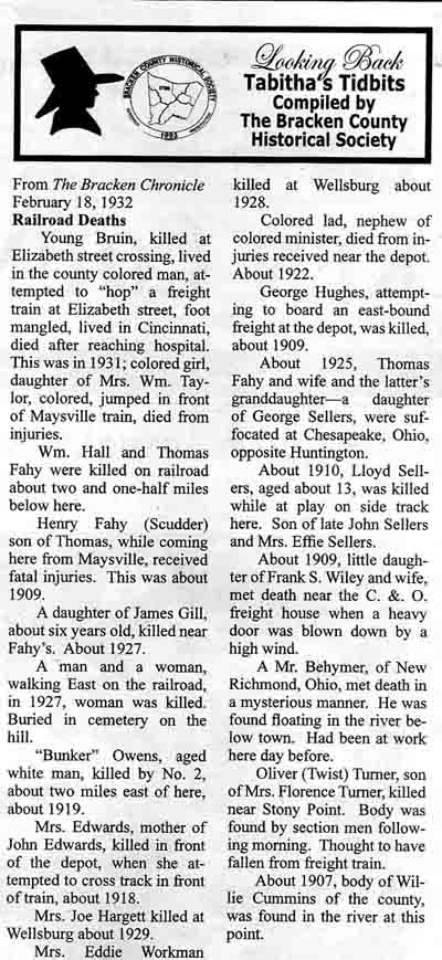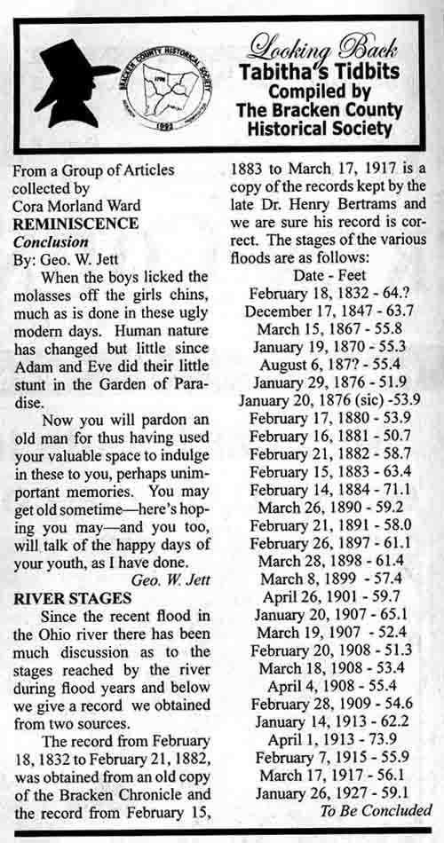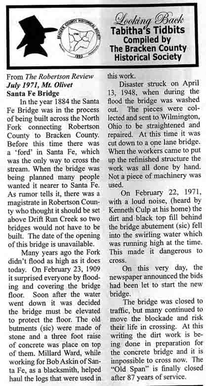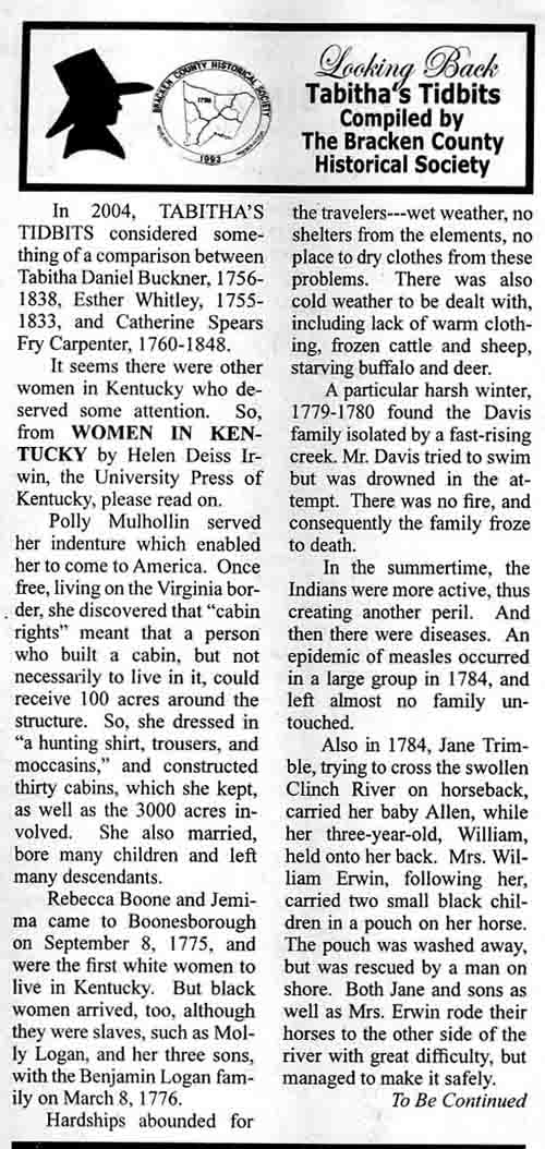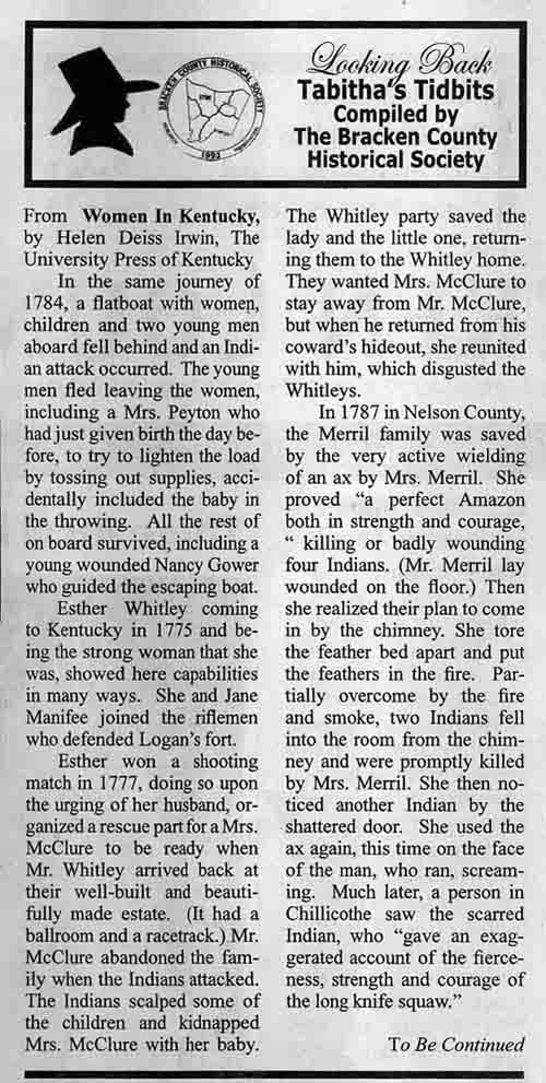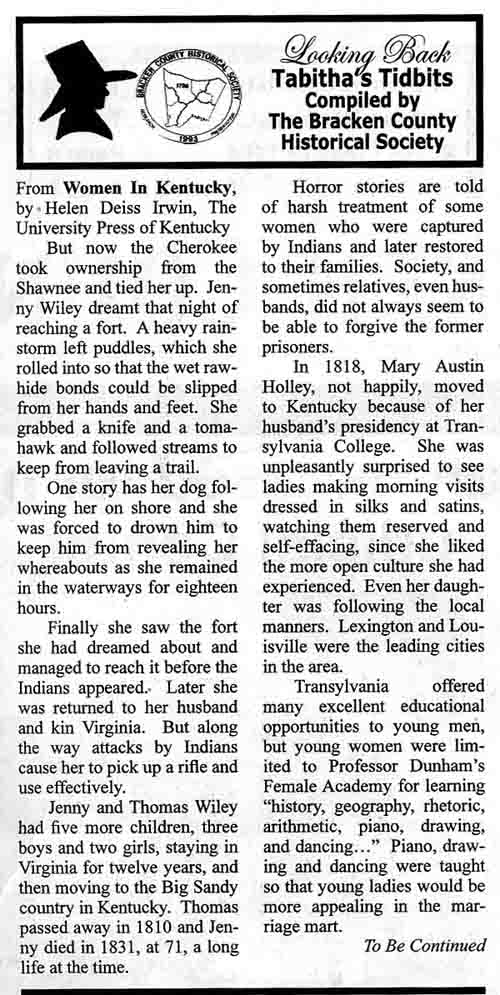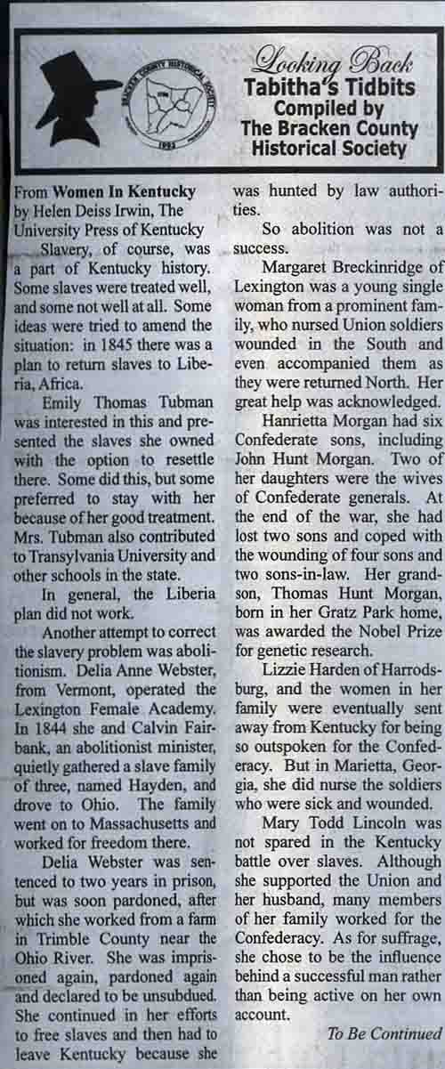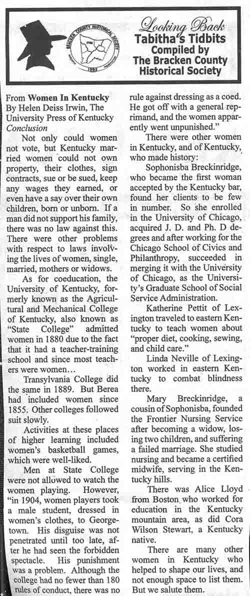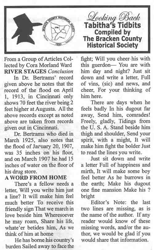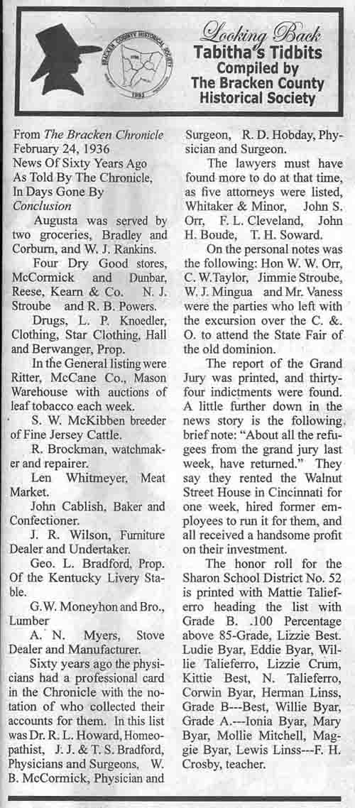 | Published weekly in the Bracken County News All materials on this website are displayed with the express written permission of The Bracken County News. To subscribe, call (606) 735-2198 or send $15 (Bracken County), $20 (Kentucky), $25 (Out-of-State) to: The Bracken County News, P.O. Box 68, Brooksville, Ky 41004 |
