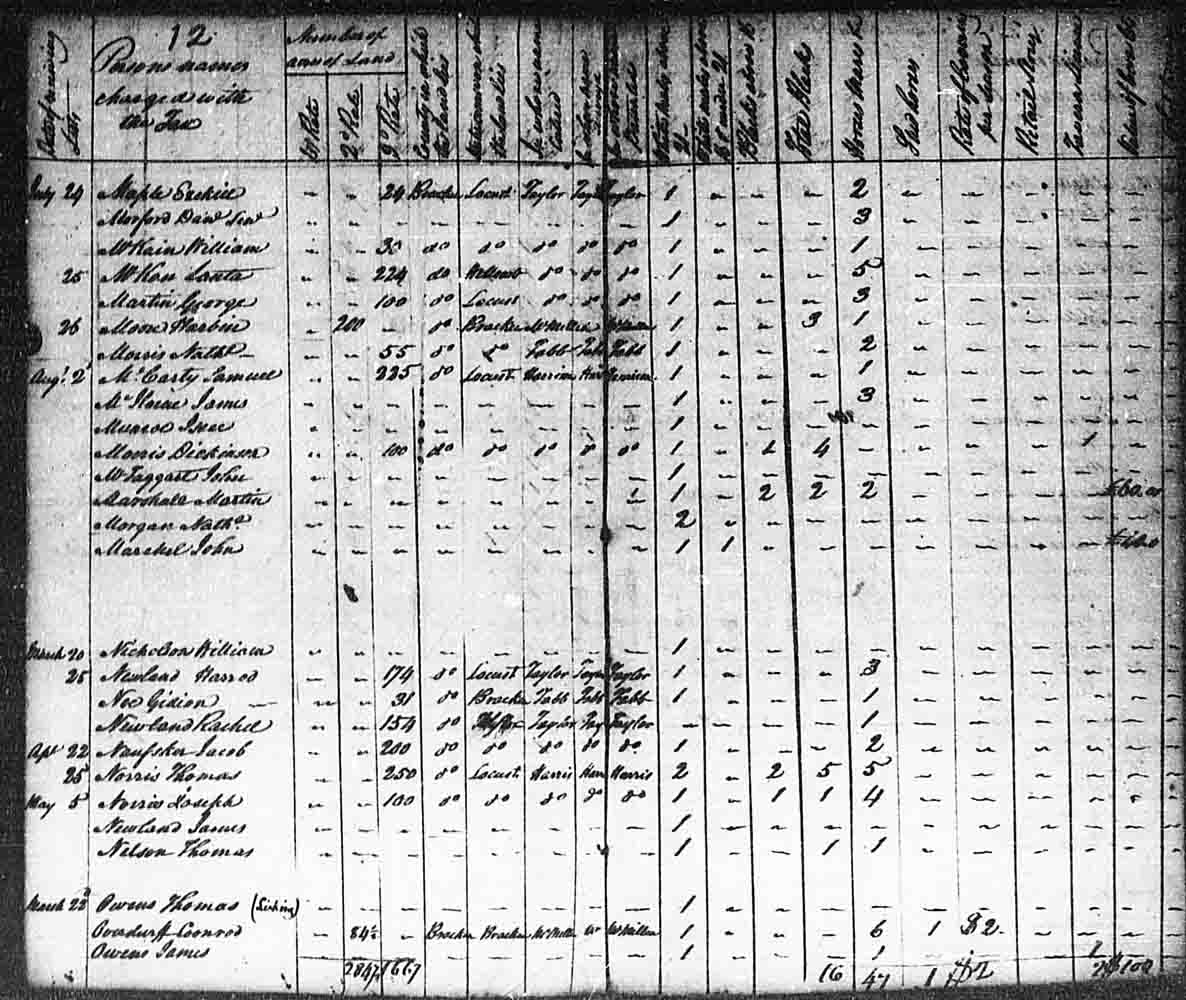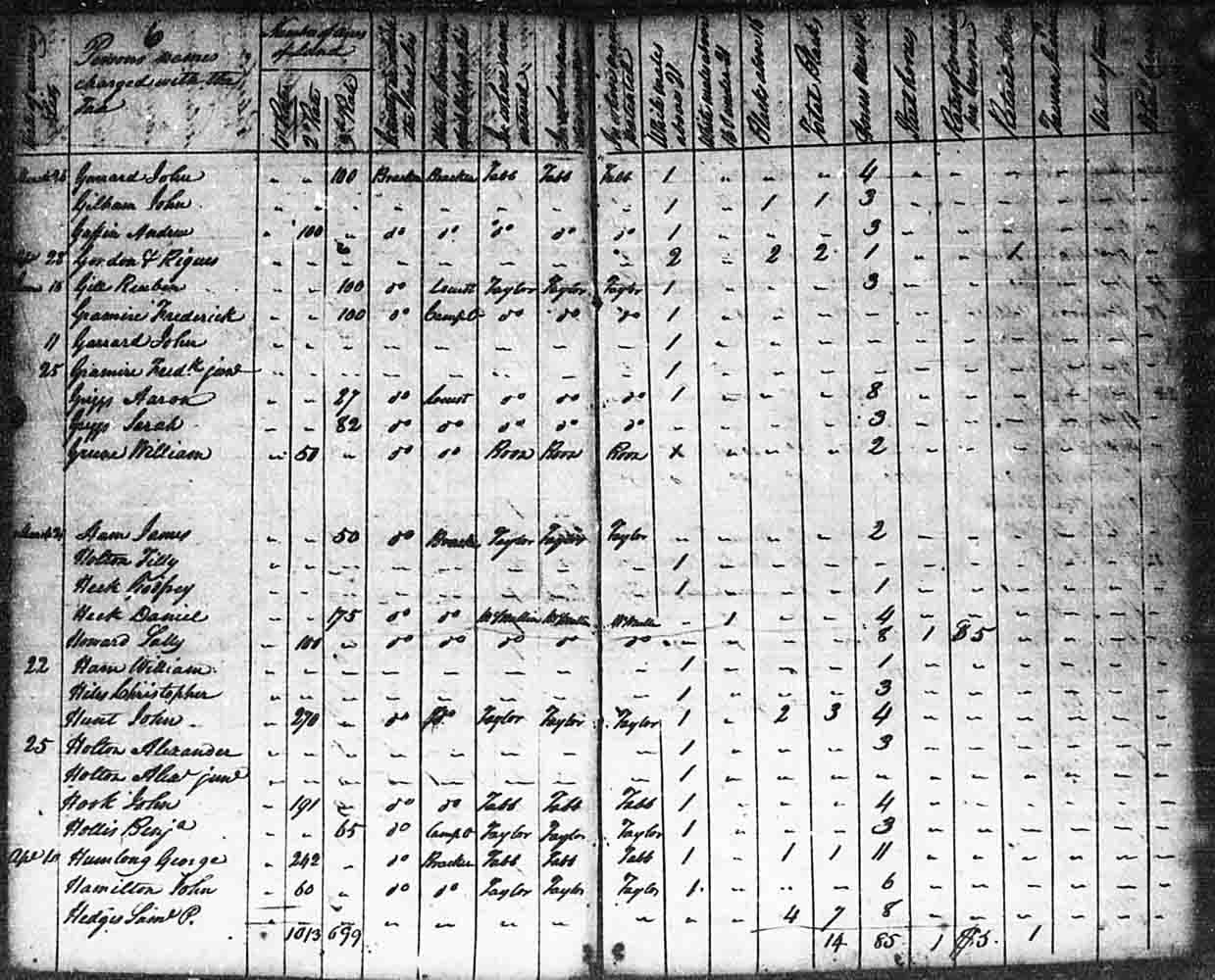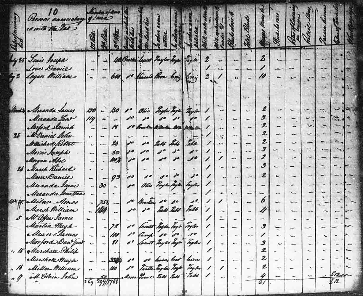 Scanned and contributed by Marla McCullough, KYGenWeb Bracken County CoordinatorSince 1790, as a requirement of the U.S. Constitution, in years ending in "0," census takers have gone out into the field to count noses. Beginner genealogists are told to start their public records research with these decennial federal census enumerations. The census records do, indeed, provide one means of pinpointing the location of a family, but they are far from comprehensive. What if the family you are seeking was overlooked? What if the census taker misspelled the surname so badly that it's beyond recognition? What about the nine years between federal census enumerations? A lot can happen in that time. Most baffling, what if your family lived in one of many states whose 1790, 1800 and/or 1890 enumerations were lost or destroyed as is the case with Kentucky? Researchers of Kentucky families have been given a gift not available in some other states, in the form of the annual county tax assessment records. Like us, our ancestors no doubt grumbled about their taxes, but their economic pain left us one of the best sources of information about the earliest Kentucky residents. The tax records reveal a lot more than the early census records. They are a year-by-year snapshot of movement within the commonwealth. They help track down ancestors affected by sudden population growth and the need to carve new counties from parts of other counties. They offer insight into the financial condition of a family. Depending on the way the tax enumerator laid out his books, it may be possible to extrapolate many details. For example, the names of watercourses and the person who filed the original land title entry may help pinpoint a deed and location of land your ancestor owned. Some tax books show the date the tax man visited your ancestor. By abstracting all names of persons visited that day you can reconstruct your ancestor's neighborhood, and possibly find his (and, yes, her) relatives. Scanning and cropping these images is very time consuming, and it isn't feasible to put all years on-line. As time permits, I plan to add years ending in "5" to bridge the halfway point between the federal census enumerations. I make no guarantees about the legibility of all images. Some old tax books are in terrible condition; torn, water damaged and chewed by insects. Please do not contact me to help interpret a name, as the image you see represents my best effort to make the writing legible. To browse 1805 Bracken County Tax Rolls alphabetically by surname, jump to: Film Start - Title Page - A, B - B, C - C - C, D - D, E, F - G, H - H - H, I, J, K - K, L - L, M - M - M, N, O - O, P - P, R - S - S, T - U, W - W, Y - Late Stragglers - Summary Saturday, 04-Jan-2025 18:19:59 CST Passed W3C link-check on December 30, 2024. This site is not responsible for URL changes by managers of external websites. | |