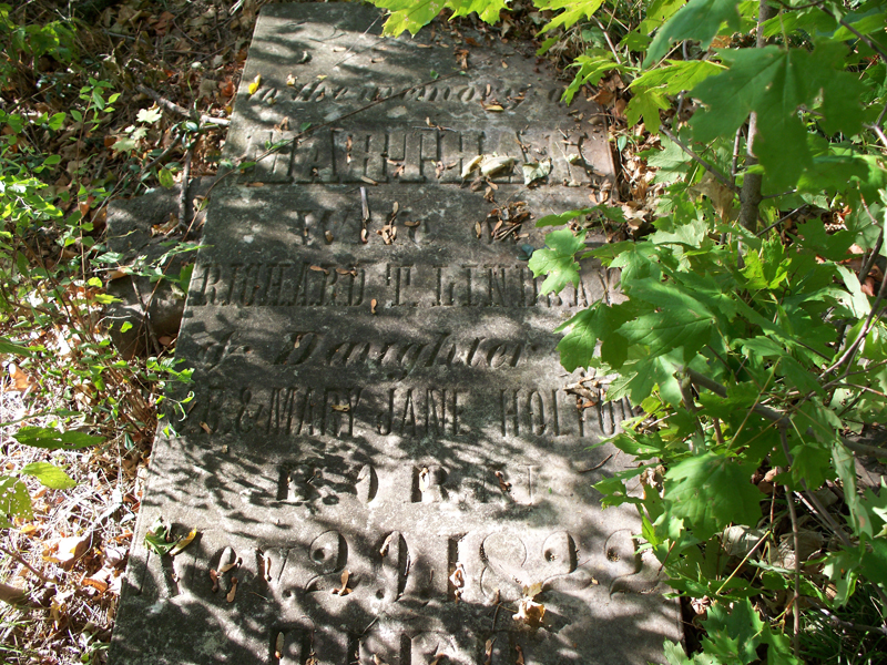 To the memory of Martha K. Wife of Richard T. Lindsay & Daughter of J. B. & Mary Jane Holton Born Nov. 29, 1822 Died July 10, 1849 [Outside the fence] |