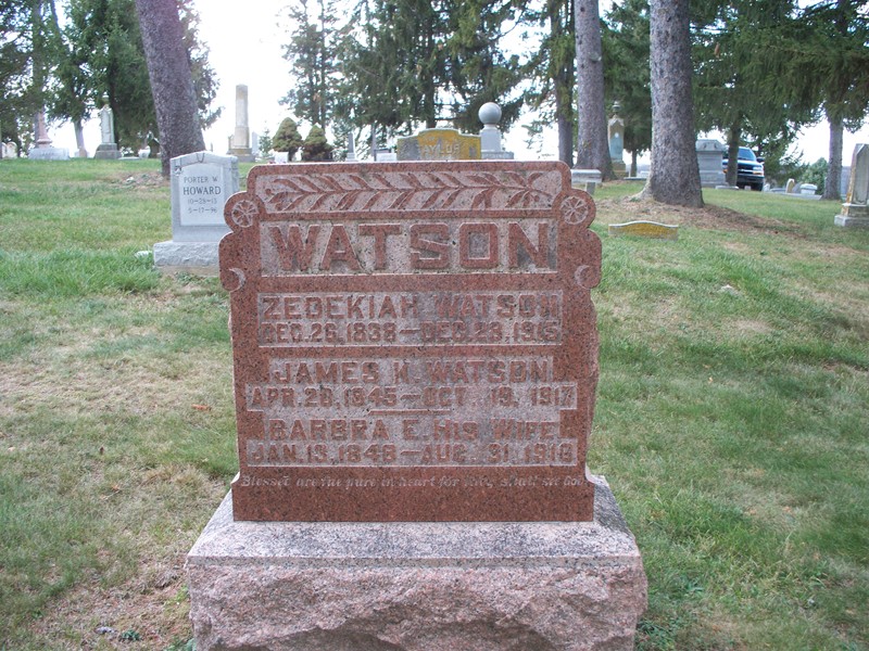 Zedekiah Watson Dec. 26, 1838-Dec. 23, 1915 James K. Apr. 20, 1845-Oct. 19, 1917 Barbra E. His Wife Jan. 13, 1848-Aug. 31, 1918 |