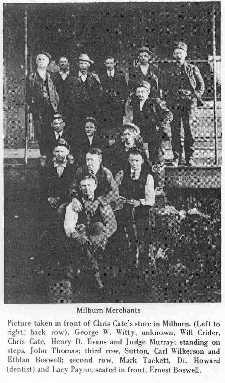 [BELOW LEFT] - Milburn Baseball Team. (back row, from left), Unknown, Isaac Jones (pitcher), Unknown, Unknown, Prentice D. George (Manager and Umpire), Jim Summers, Catcher, Unknown and Iva Peebles.