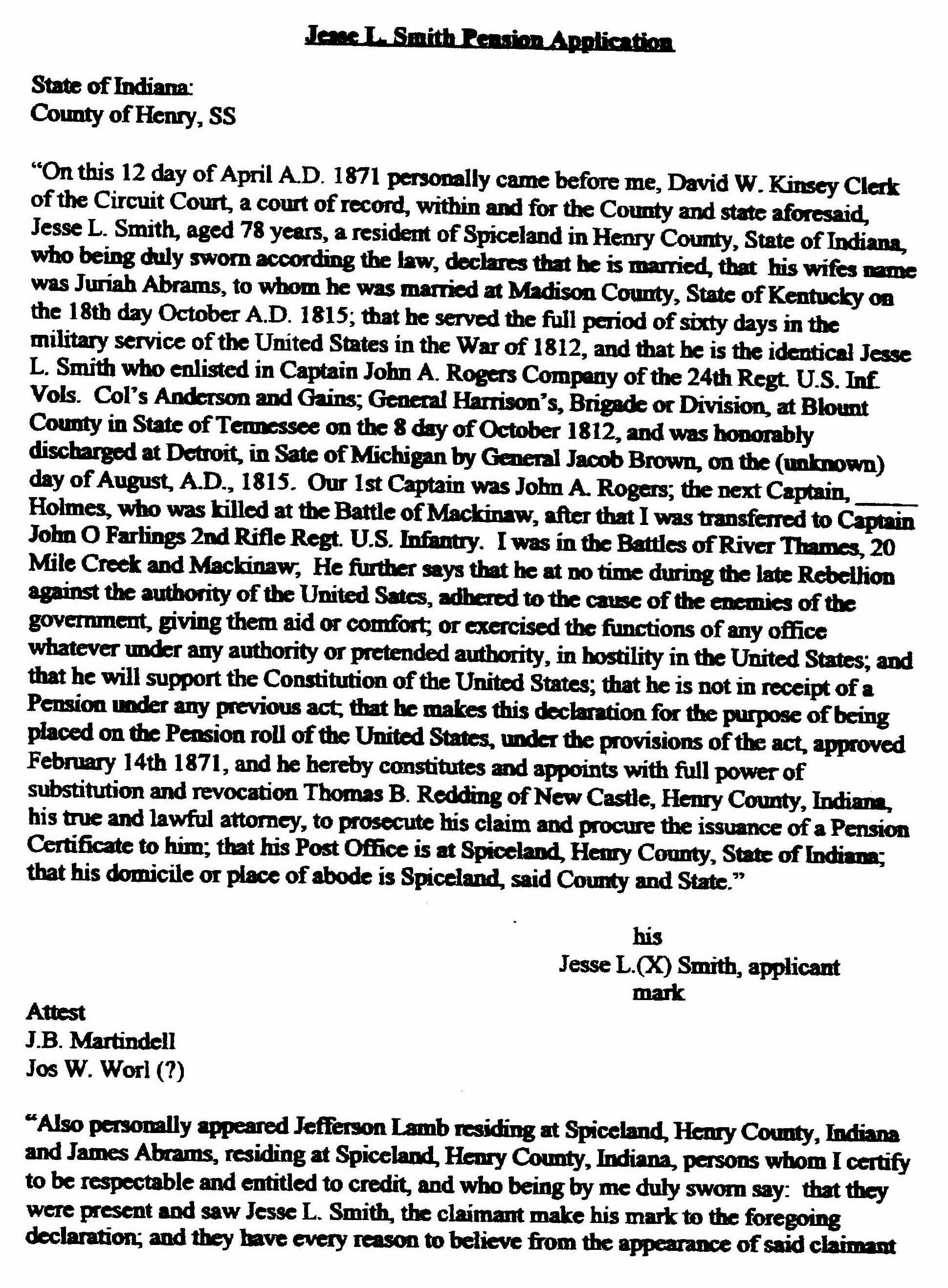 Jesse L Smith born in Eastern TN, on 5 Nov 1793, died in Spiceland, IN, Henry County, buried in Old Friends Cemetery in Spiceland.