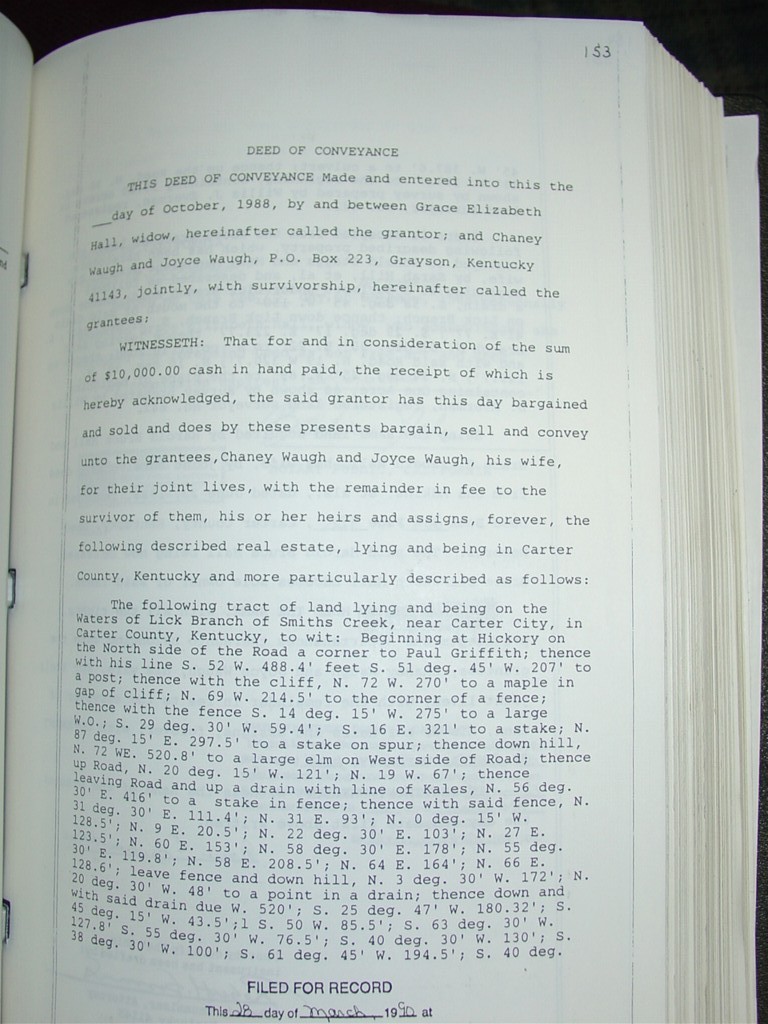 Deed Book 204, Page 153 reflects a conveyance of 35 acres from Grace Elizabeth Hall (widow) to Chaney Waugh in October of 1988. The deed indicates that a survey by Willis J. Everman was completed. This deed states that the property was purchased/inherited from Harold Bruce Hall and Grace Elizabeth Hall, Ona Adkins at al as recorded in Deed Book 204, Page 130.