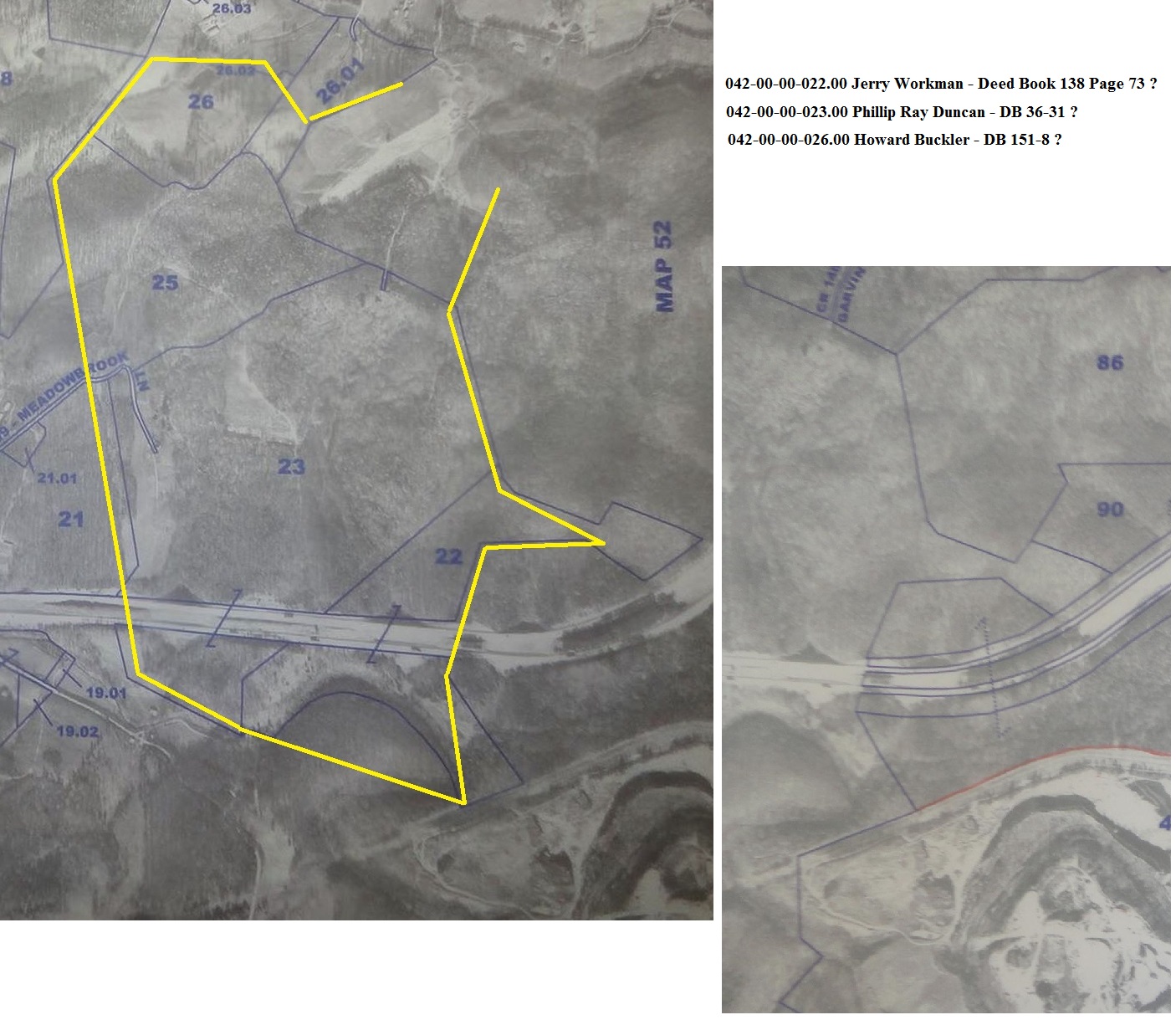 241 same ??? or sess(?) to have and to hold the above described tract of land with all and singular appurtenances therunto belonging unto the said Mathew Madden and his heirs forever, and the aforesaid John N. Ross doth bind himself, his heirs & to warrant and defend the title to the above lands against the claim or claims of all and every person or persons whatsoever in witness thereof the aforesaid John N. Ross together with Nancy Ross, his wife, who doth hereby relinquishes her right of dower in and to the lands conveyed in this deed, given under our hands and seals this 18 day of August 1867. John N. Ross Nancy Ross State of Kentucky Carter County I, Elias P. Davis, Clerk of the County Court in and for the County and State aforesaid do certify that this deed from John N. Ross & Nancy Ross to Mathew Madden was produced to me in my office on the 18th day of August 1867 and the said John N. Ross acknowledged his signature to be his act and deed hand and seal for the purpose herein mentoned and the said Nancy Ross was examined by me seperate from her husband and she on her own free will and consent acknowledged her signature to be her act and deed hand and seal and also relinquished her right of dower to the within conveyed land and premises and said she did not wish to retract the same ????? the said deed together with this certificate are duly recorded and stamped according to law, given under my hand this 18th day of August 1867. E. P. Davis, Clk By Oliver Miller, DCThe western boundary call of "N 17 W 110" corresponds to that same call in Deed Book B Page 283.