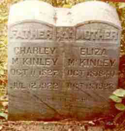 Photo of Charles and Elizabeth "Eliza" Guthrie McKinley. Charles McKinley was born 11 Oct 1827 and died 12 July 1922, he was married twice. He was the 50 years old when his son George Alexander McKinley was born. Known as "Charley", he lived to be 95. Eliza Guthrie McKinley was born 18 Oct 1840 and died 18 Oct 1923. She was the daughter of Demsey Guthrie and Ann Ellis; the granddaughter of Stephen Guthrie and Elizabeth Grider; great-granddaughter of Martin Grider and Sarah Coffee. They are buried in Bristow Cemetery, also known as Upchurch Cemetery, which is close to Ermon McKinley Catron's old home. |