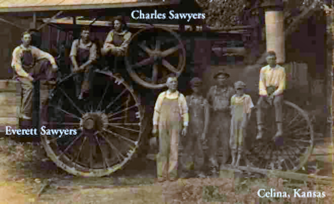 Far left: Everett Sawyers, son of James Walker Sawyers and Mary Olive Griffin Sawyers. Third from left: Charles Elmer Sawyers, son of Frederick Hartwell Sawyers and Nancy Leann Guthrie Sawyers. This photo was taken in Celina, Kansas about 1920. |