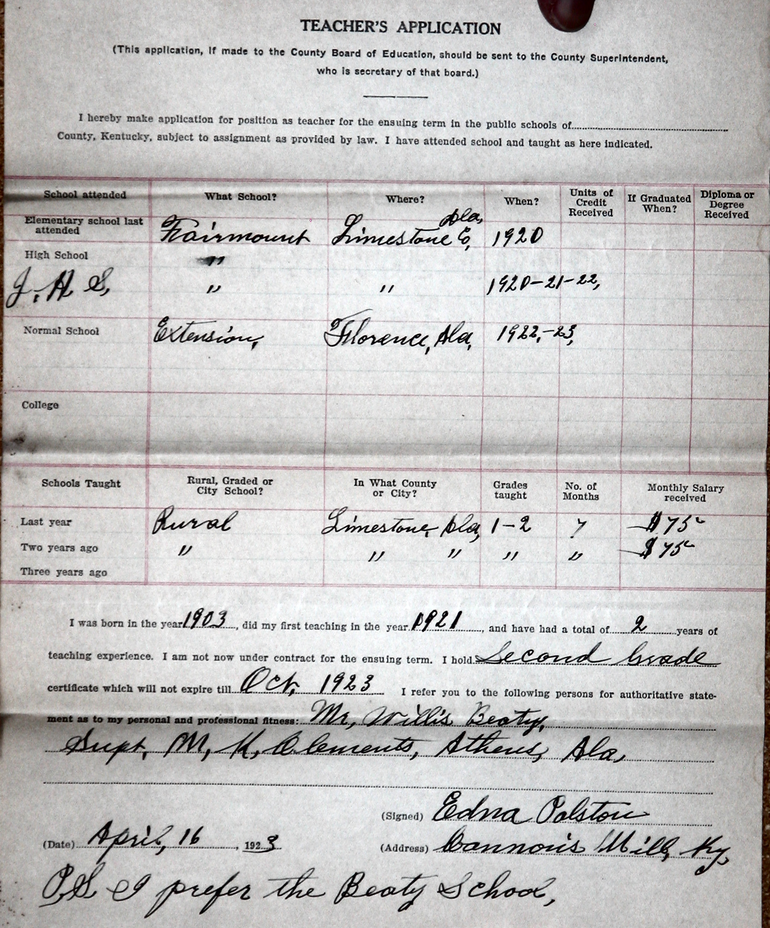 Edna Polston Teaching Application Mom and