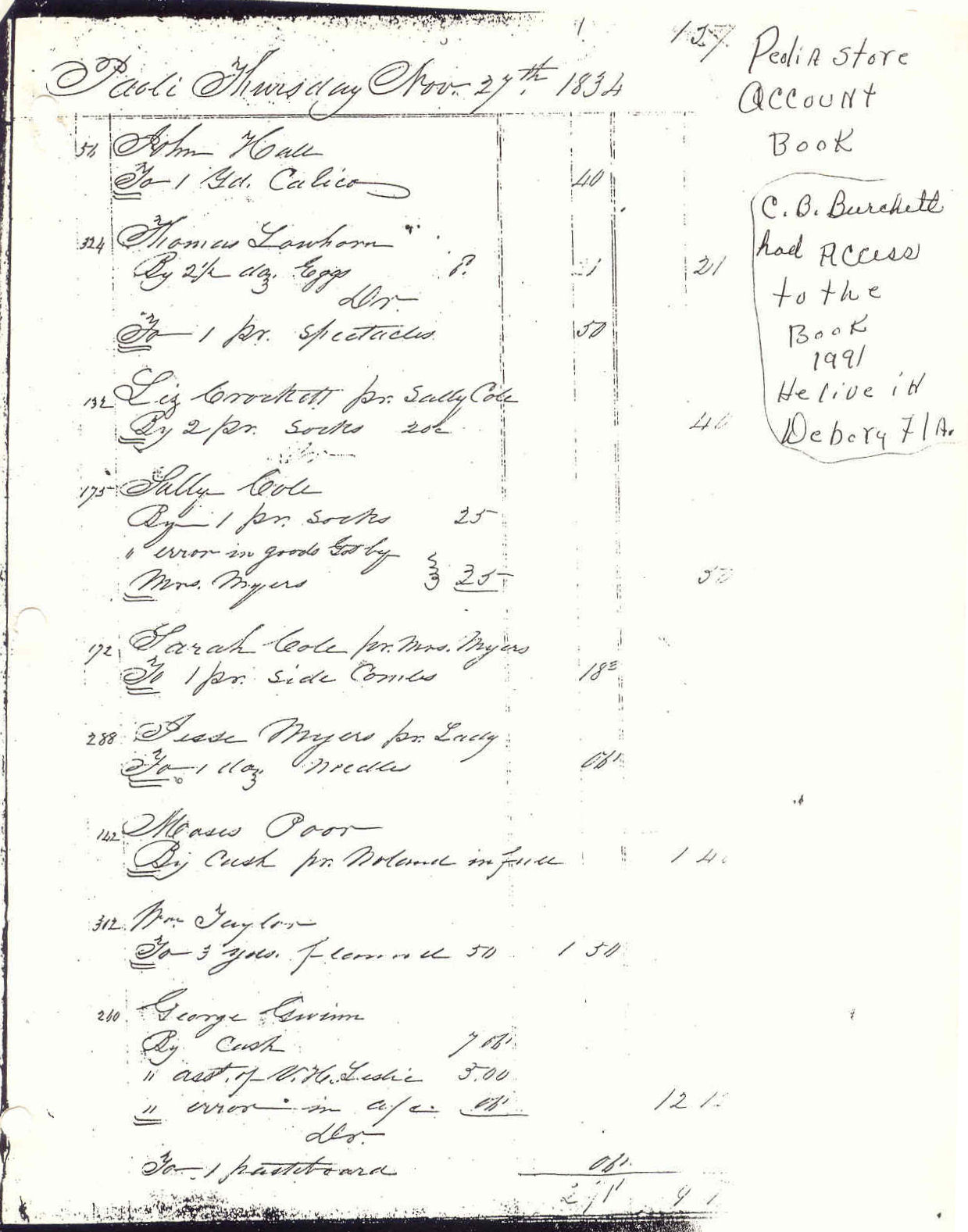 Delphiniah Woolsey pr. Lady By 35 1/2 yds. Linsey 40c 14.20 By 5 pr. socks 20 c1.00 |