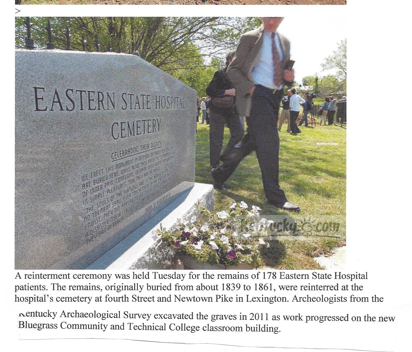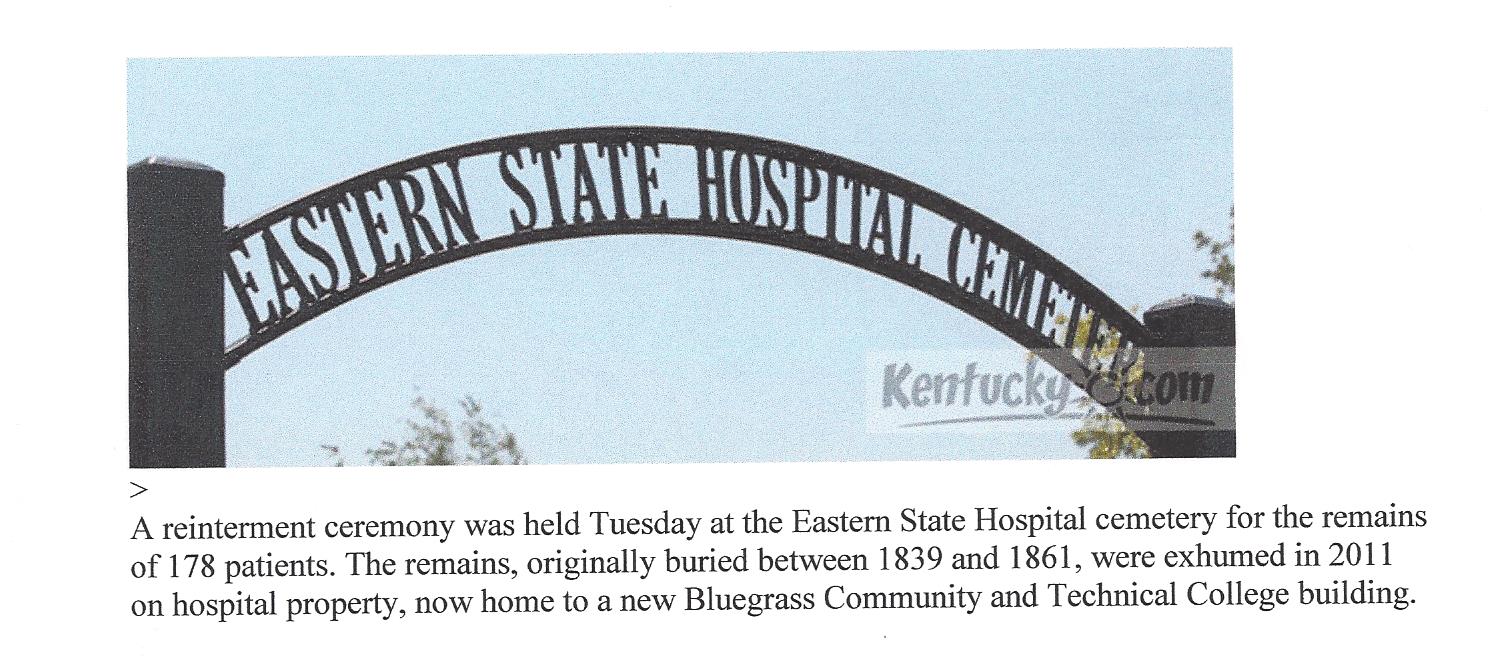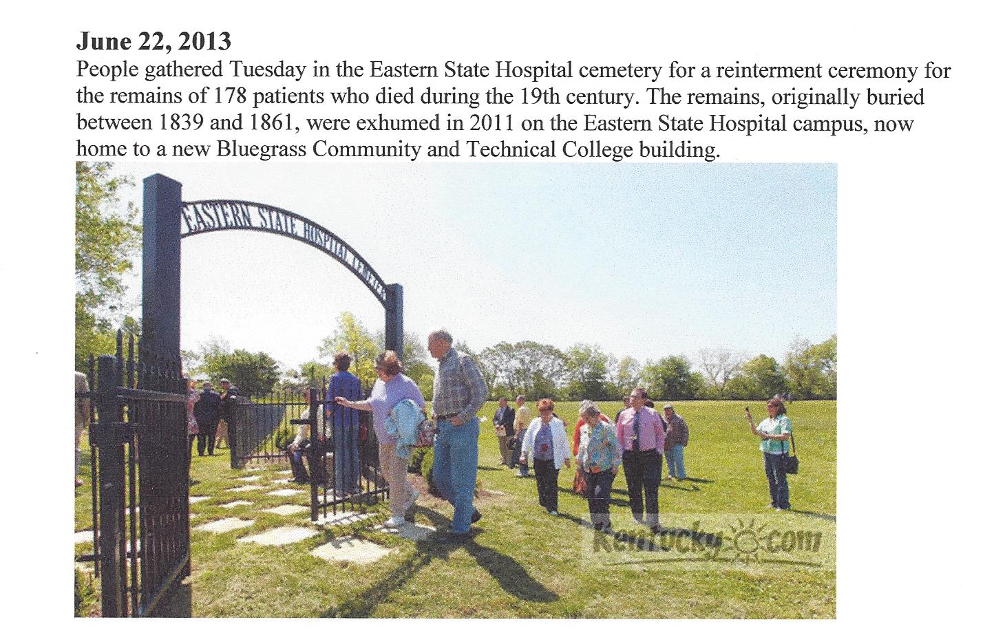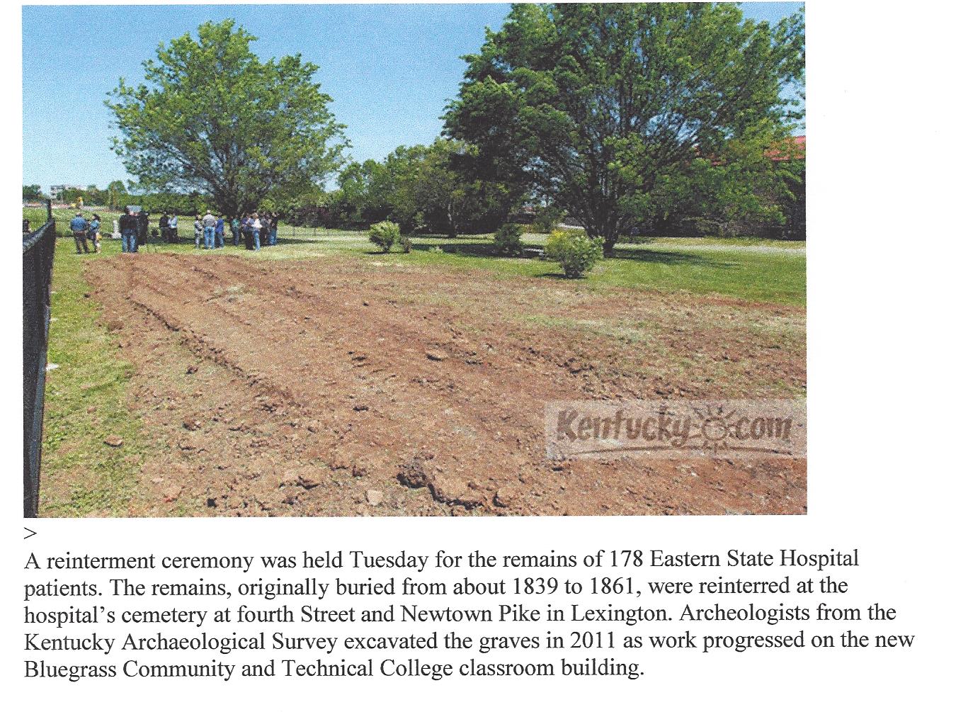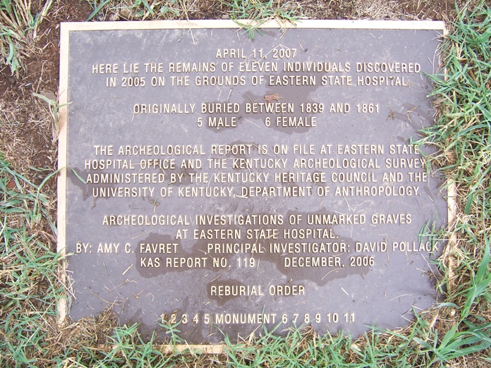 In June of 2005 eleven graves were unearthed while laying new water lines on the hospital grounds. Ten of the remains were in a mass grave, with the 11th grave nearby. After nearly two years of studying the remains by the University of Kentucky Archeological Department, they were interred on April 11, 2007 at Eastern State Hospital. Each of the remains were placed in a plan wooden box with a small plate describing the sex and estimated age. Per the archeological report, it was estimated that the original burials occurred sometime between 1830 and 1860.
