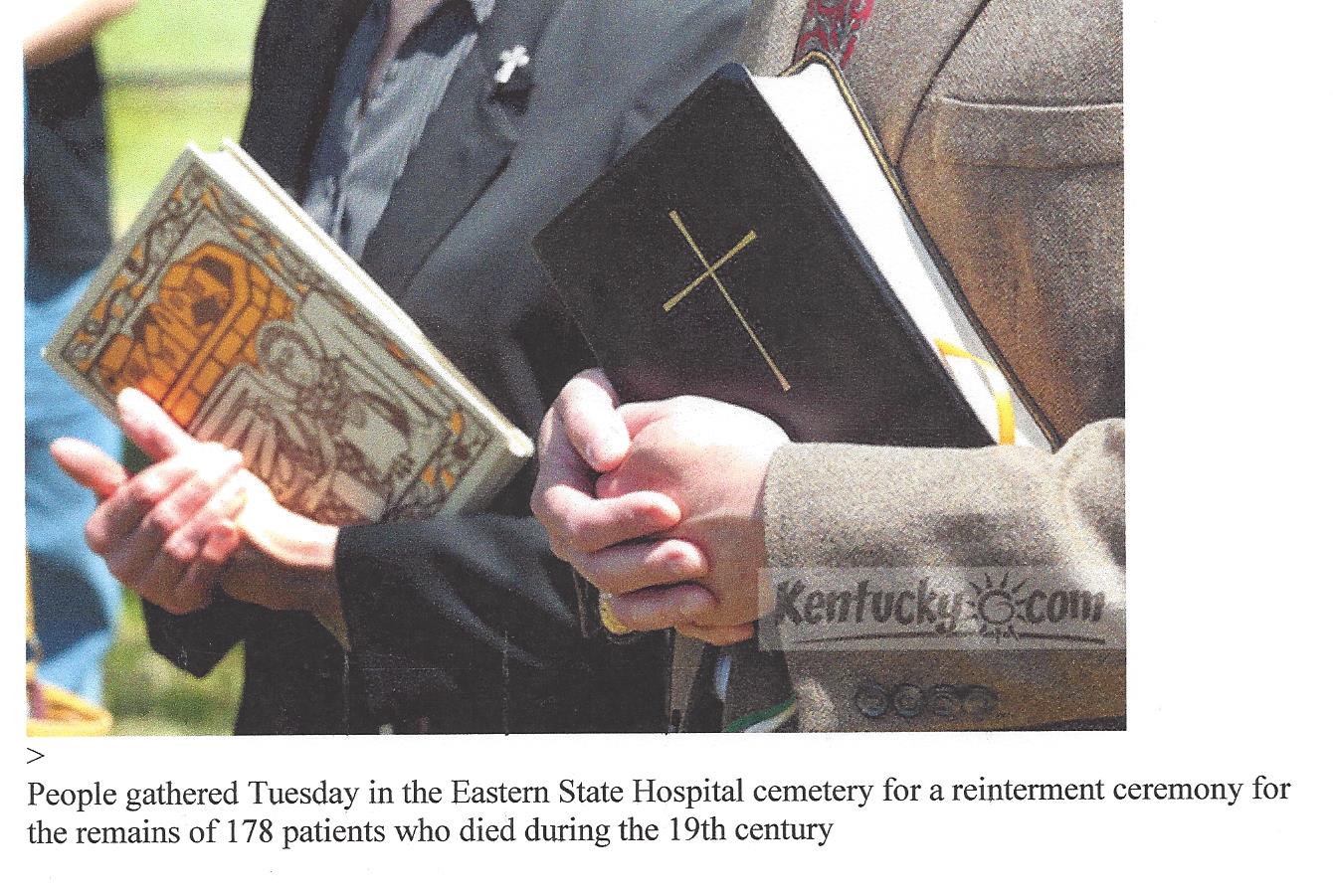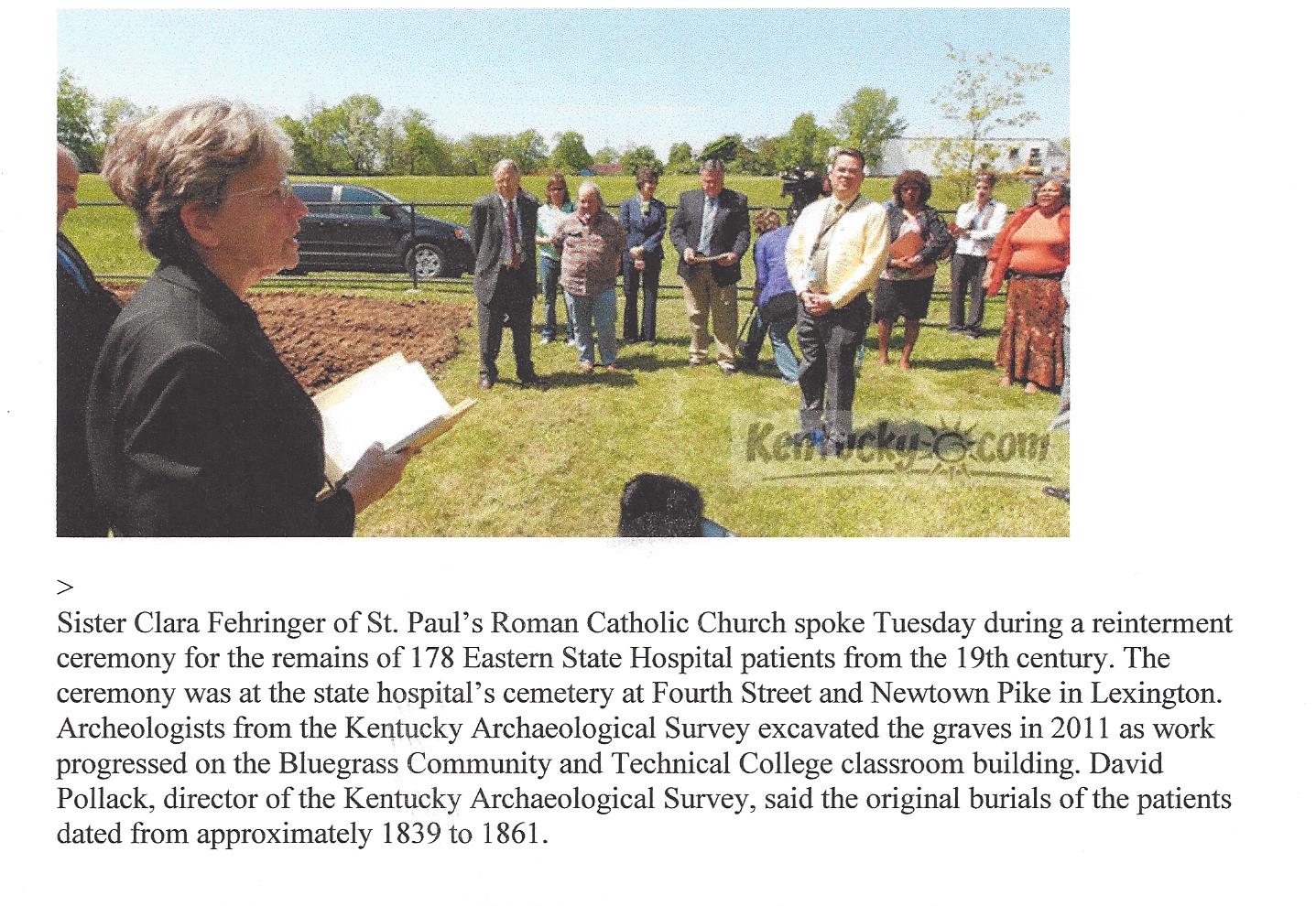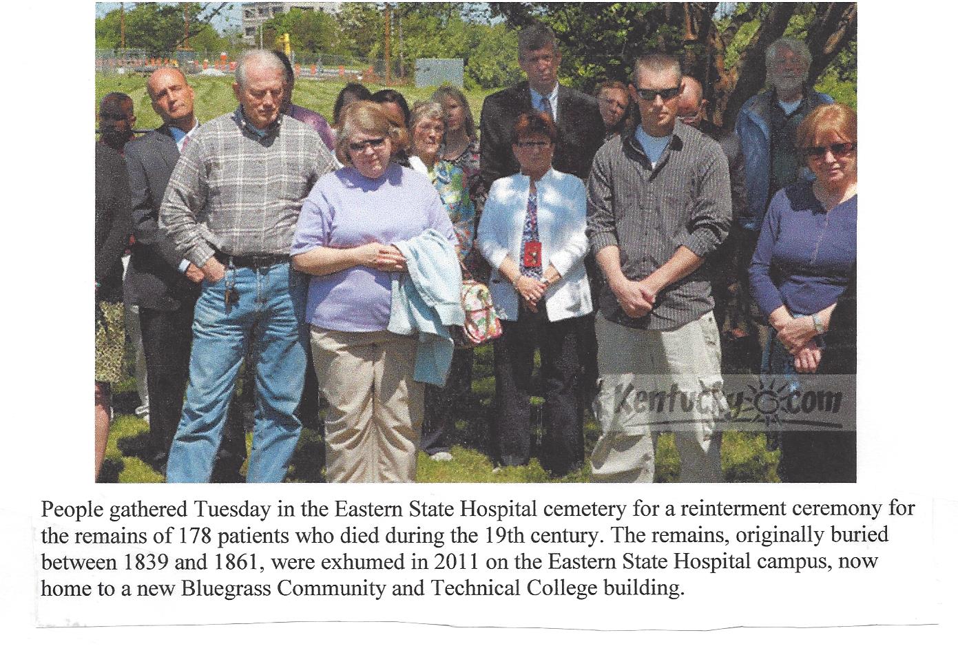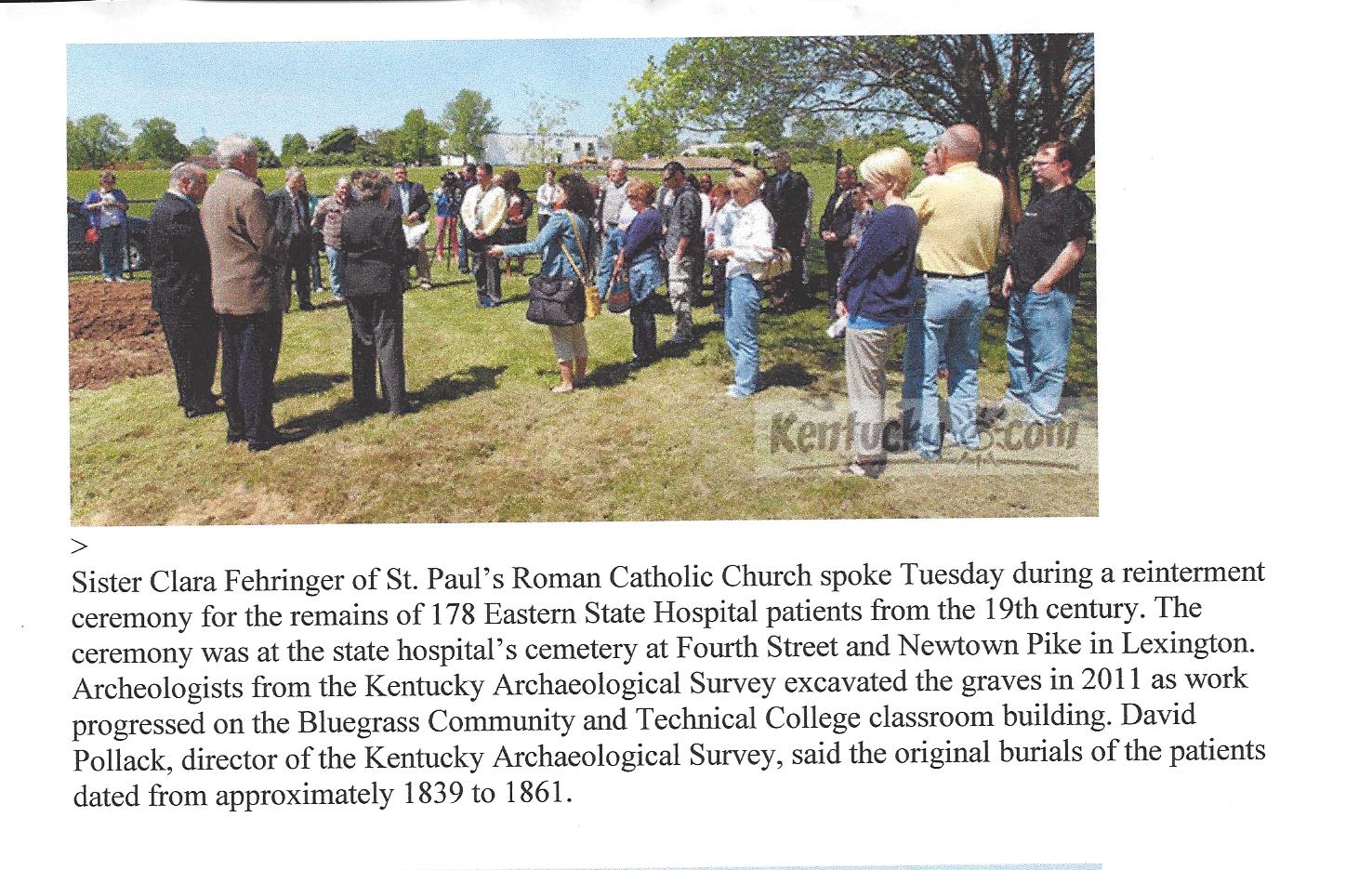 In June of 2005 eleven graves were unearthed while laying new water lines on the hospital grounds. Ten of the remains were in a mass grave, with the 11th grave nearby. After nearly two years of studying the remains by the University of Kentucky Archeological Department, they were interred on April 11, 2007 at Eastern State Hospital. Each of the remains were placed in a plan wooden box with a small plate describing the sex and estimated age. Per the archeological report, it was estimated that the original burials occurred sometime between 1830 and 1860.